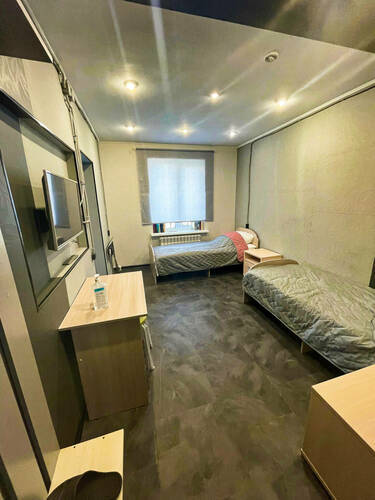 Одноместный номер оборудован: - одной 2-х спальной кроватью; - минихолодильником; - прикроватной тумбочкой; - телевизором с кабельным ТВ; - Wi-Fi; - вешалкой для размещения личных вещей. Удобства (душ, туалет, умывальник) расположены непосредственно в номере. В местах общего пользования (коридор) расположены холодильники, микроволновые печи, кулеры.