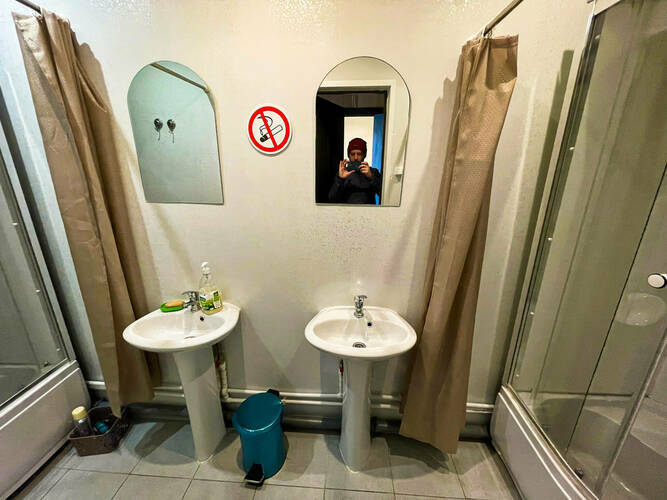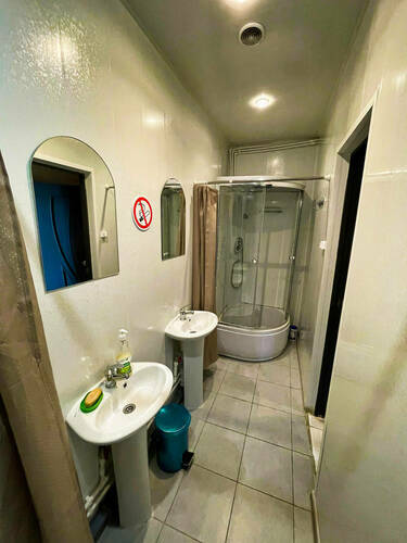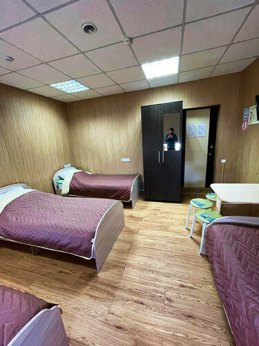 4-х местный общий номер оборудован: - 4 односпальными местами; - шкафом и вешалками для размещения личных вещей; - столом для приема пищи; - телевизором с кабельным ТВ; - Wi-Fi. Удобства (душ, туалет, умывальник) общие, расположены на этаже. В местах общего пользования (коридор) расположены холодильник, микроволновая печь, кулер.