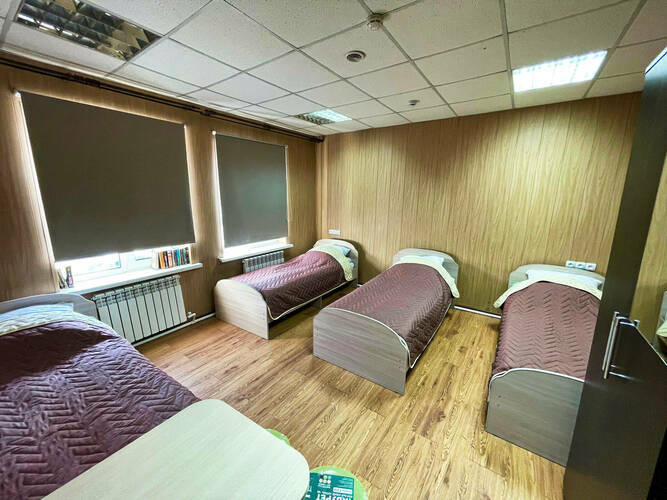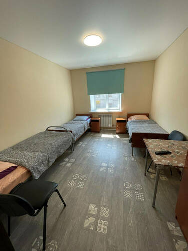 3-х местный общий номер оборудован: - 3 односпальными кроватями; - шкафом и вешалками для размещения личных; - столом для приема пищи; - телевизором с кабельным ТВ; - Wi-fi. Удобства (душ, туалет, умывальник) общие, расположены на этаже. В местах общего пользования (коридор) расположены холодильник, кулер, микроволновая печь.