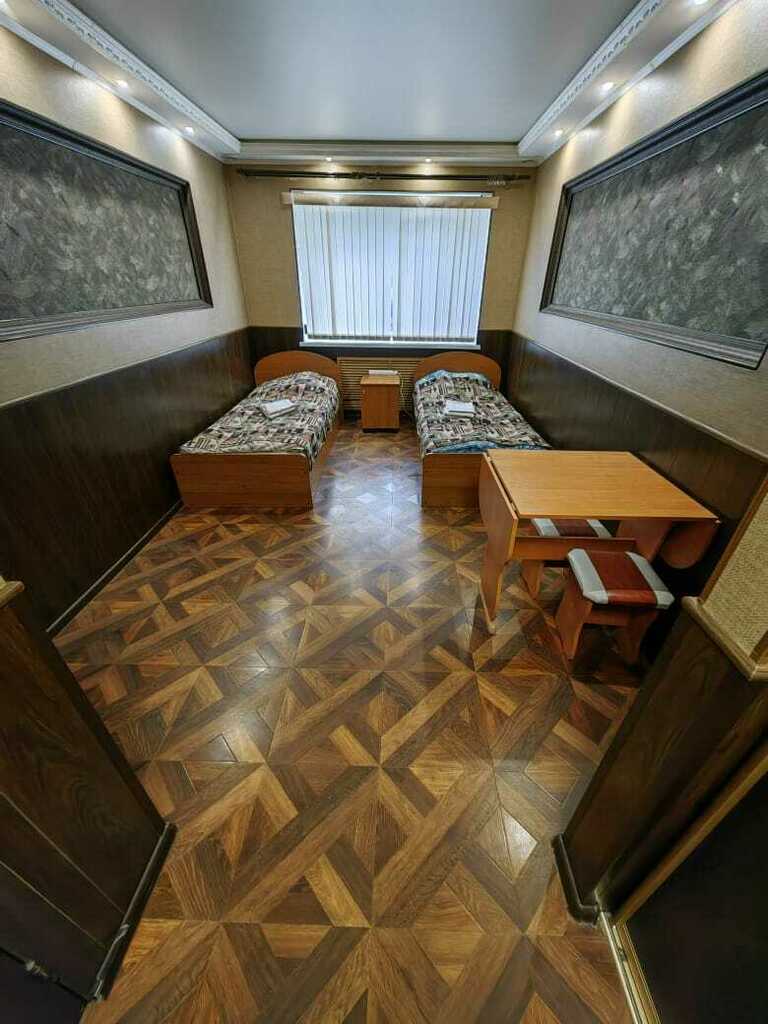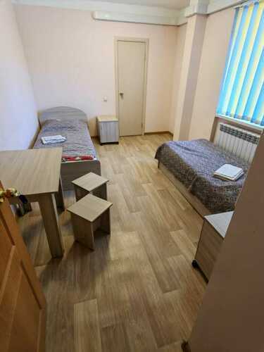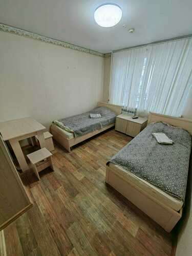 Уютный номера имеет индивидуальный с/у (душевая кабина, умывальник с зеркалом, унитаз) оборудован двумя односпальными кроватями с прикроватной тумбой, телевизором с кабельными каналами, столом с табуретами и вешалкой для одежды. В общем пользовании имеются: холодильник, поттер, микроволновая печь, автоматическая стиральная машинка, комната для сушки и глажки. Доступ в номер осуществляется по коду.