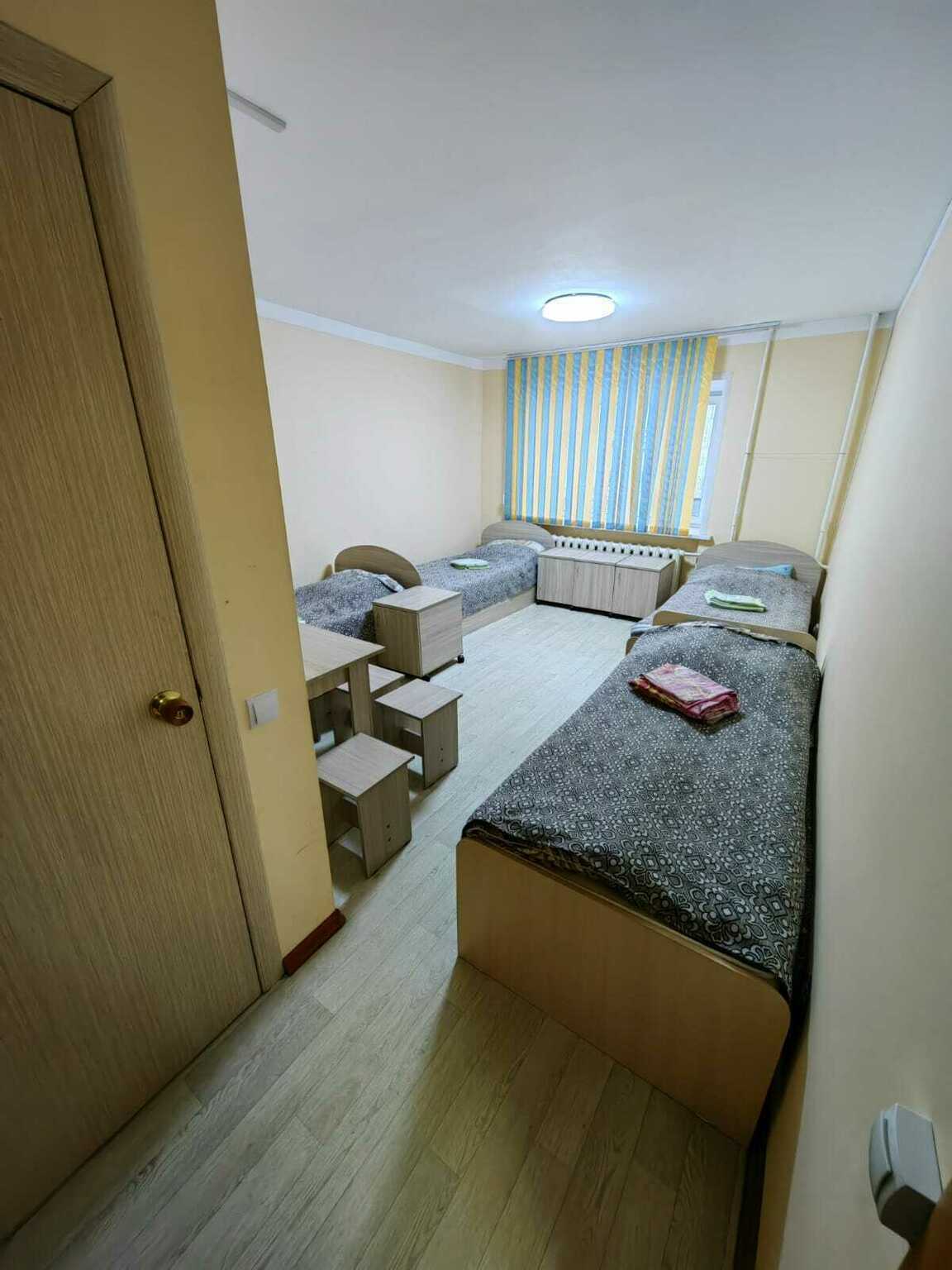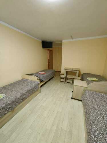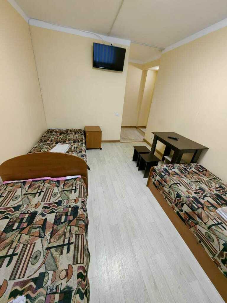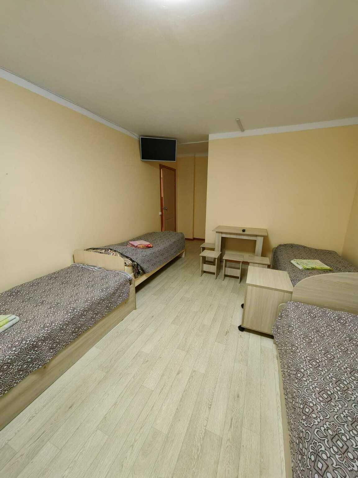 Уютный номера имеет индивидуальный с/у (душевая кабина, умывальник с зеркалом, унитаз) оборудован тремя односпальными кроватями с прикроватной тумбой, телевизором с кабельными каналами, столом с табуретами и вешалкой для одежды. В общем пользовании имеются: холодильник, поттер, микроволновая печь, автоматическая стиральная машинка, комната для сушки и глажки. Доступ в номер осуществляется по коду.