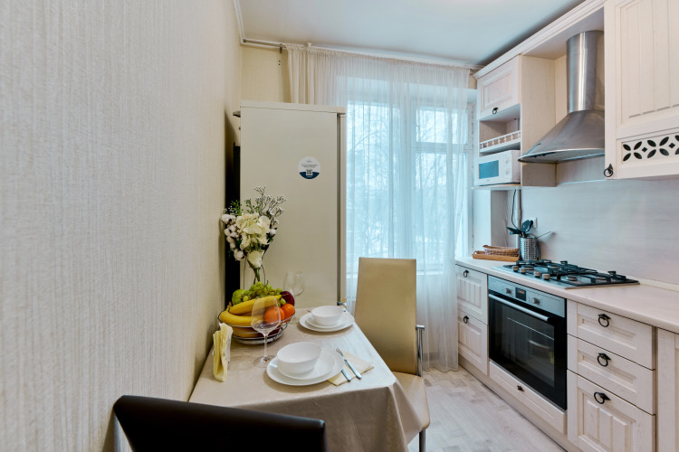 В апартаментах могут разместиться одновременно от 1 до 5 человек. В спальне имеется двуспальная кровать, шкаф. В гостиной — двуспальная кровать и раскладывающийся диван, шкаф купе. В распоряжении гостей есть: безлимитный интернет Wi-Fi, ЖК телевизор, холодильник, стиральная машина, электрический чайник, СВЧ, фен, утюг, гладильная доска, посуда.