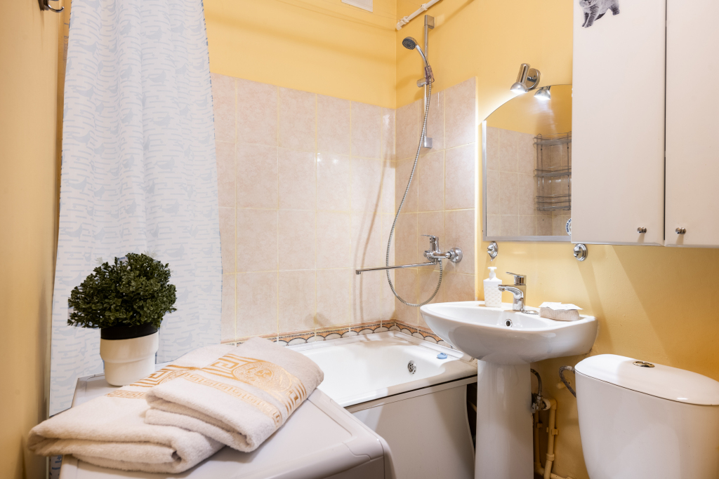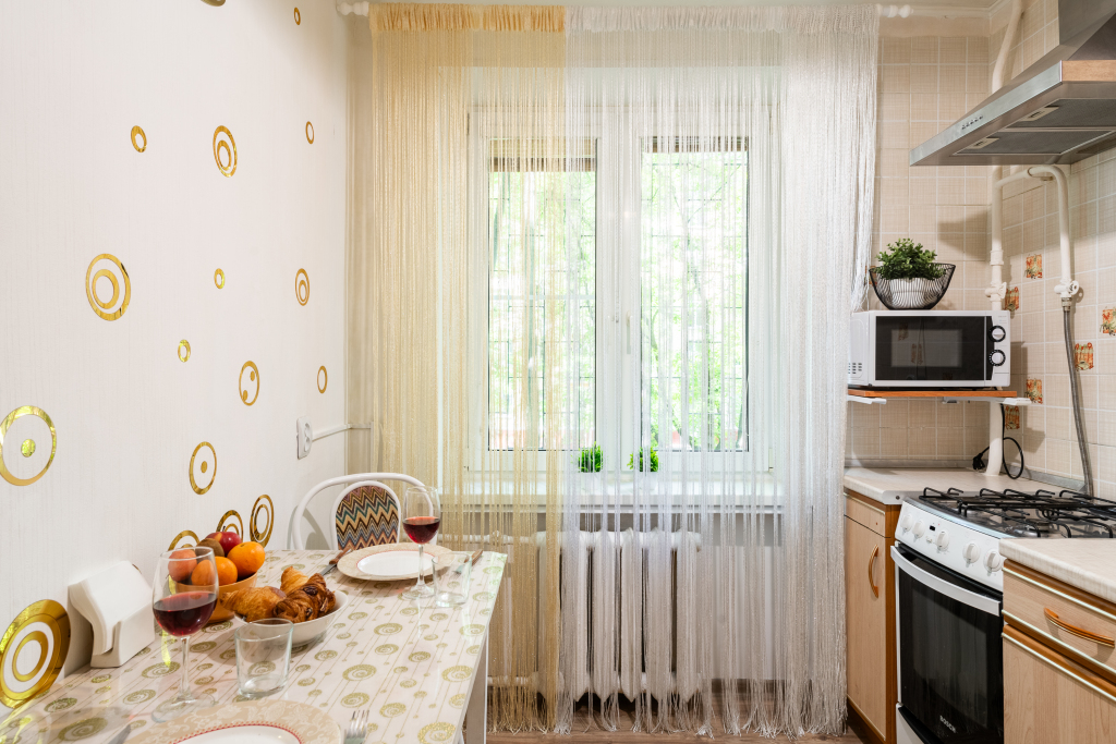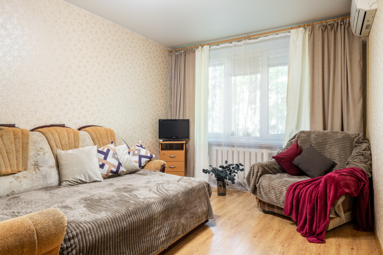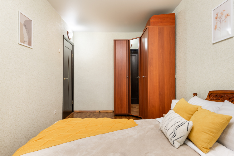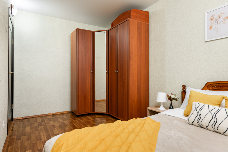 Двухкомнатные апартаменты рассчитаны на 5 человек: 5 спальных мест — кровать, раскладной диван и раскладное кресло, парковка для автомобиля во дворе, кондиционер, обогреватель, телевизор, Wi-Fi. Окна выходят во двор. На кухне есть микроволновка, плита, духовка, чайник, холодильник, набор посуды на 5 человек, чай, кофе, соль, сахар, масло.