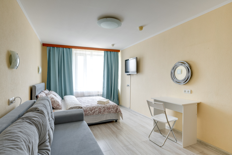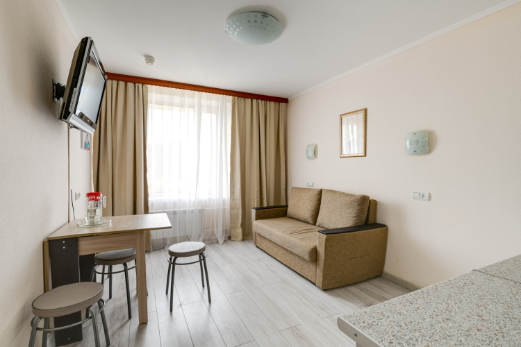 Номер уютно обставлен и оснащён необходимым, чтобы отдохнуть после долгого и насыщенного дня. Имеются телевизор. Оснащение зависит от выбранной категории номера.