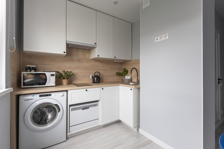 К услугам гостей телевизор со смарт ТВ, холодильник, стиральная машина, гладильная доска, утюг, сушилка для белья и фен. Также в комнате есть небольшое рабочее место с отдельным освещением.