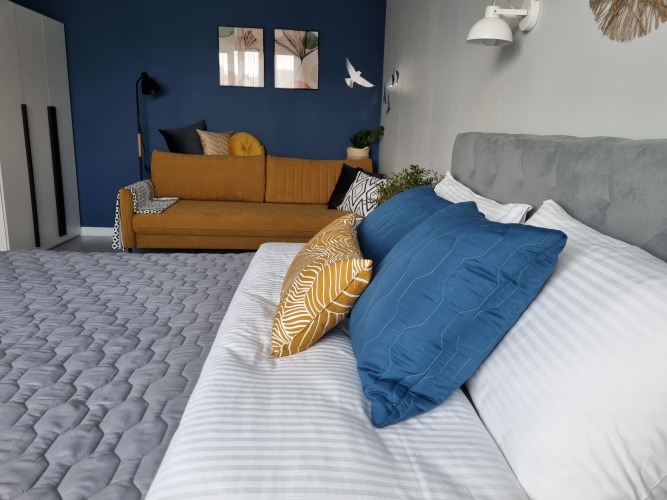 Квартира площадью 38 кв. м подходит для размещения 4-х взрослых гостей. В квартире одна комната и отдельная кухня. В спальне-гостиной предусмотрено 4 спальных места: кровать с ортопедическим матрасом 160x200 см и диван-кровать 150x200 см.