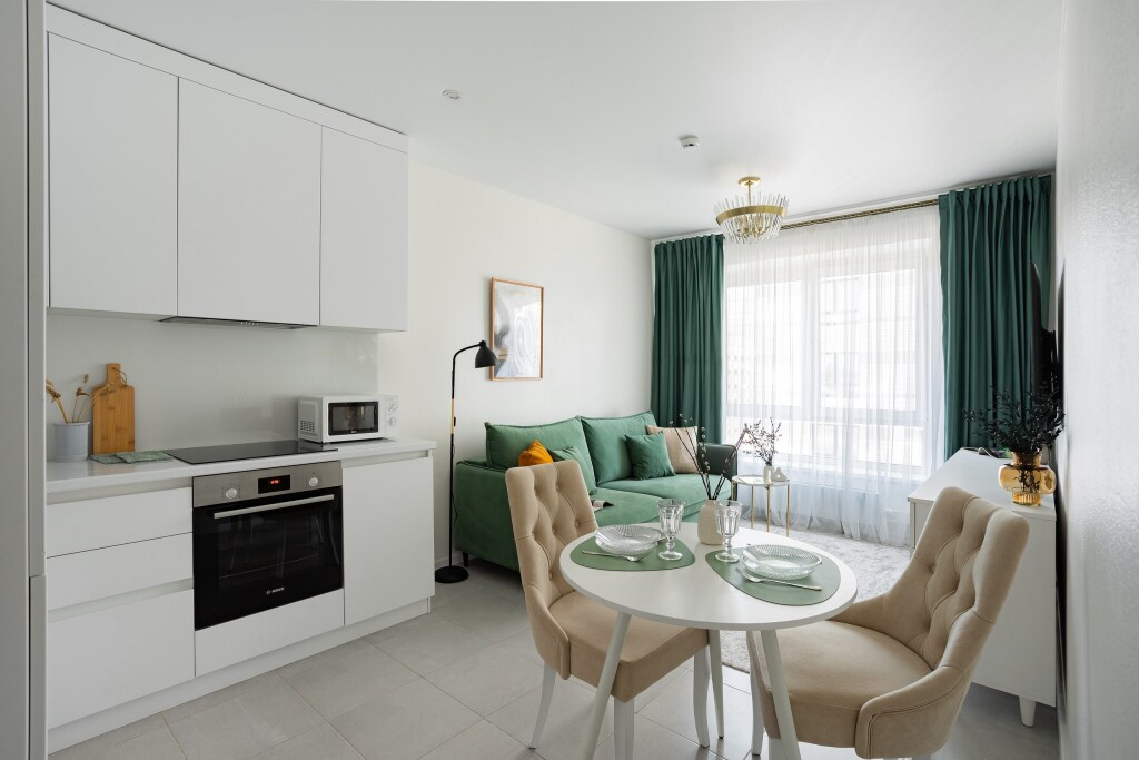 Апартаменты «Изумруд для 4 гостей» находятся в Москве. Апартаменты с одной спальней и кухней-гостиной расположены в жилом комплексе «Бунинские луга» с закрытой территорией. Жилой комплекс оснащён объектами инфраструктуры: магазинами, кафе, ресторанами, внутренними дворами. В пешей доступности находится станция метро «Потапово».