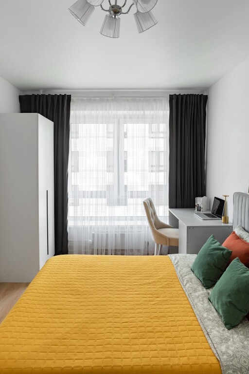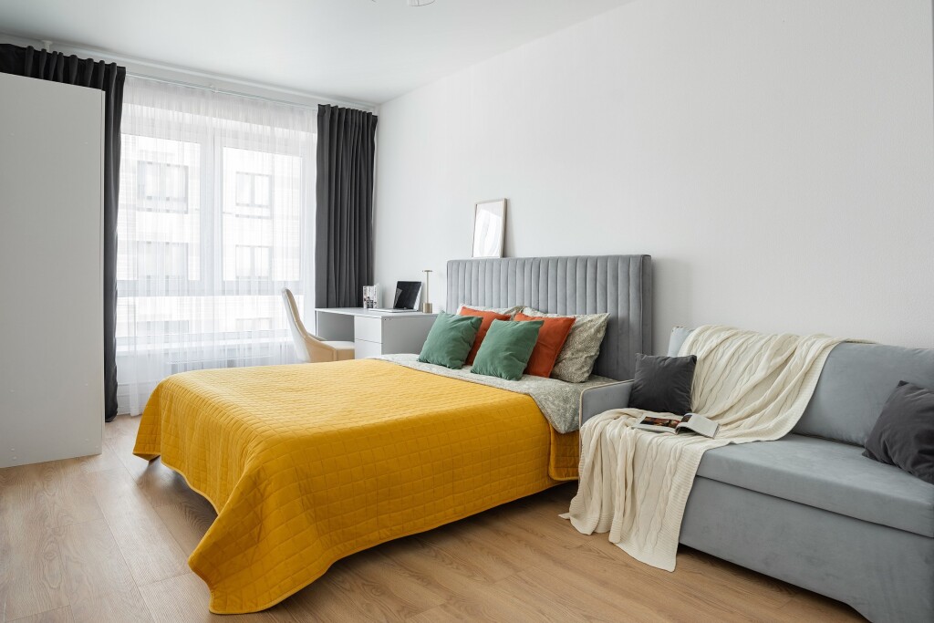 Максимальное размещение — до 4 гостей. Спальные места: кровать 160×200 см в спальне и диван-кровать 160×200 см в гостиной.