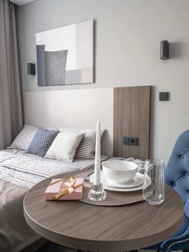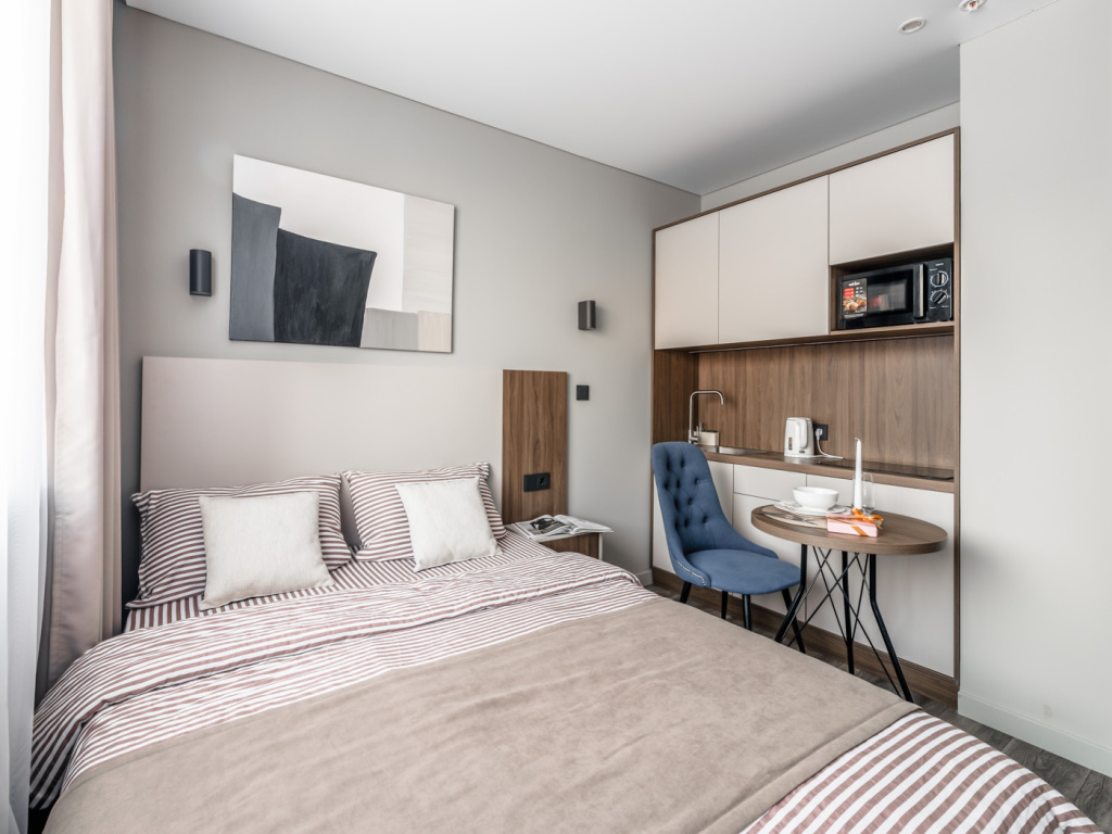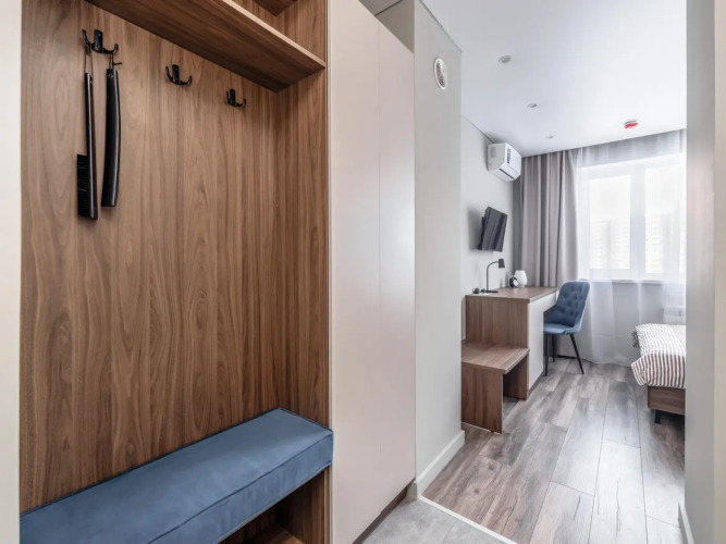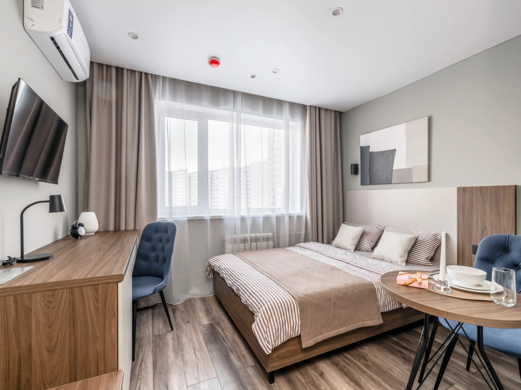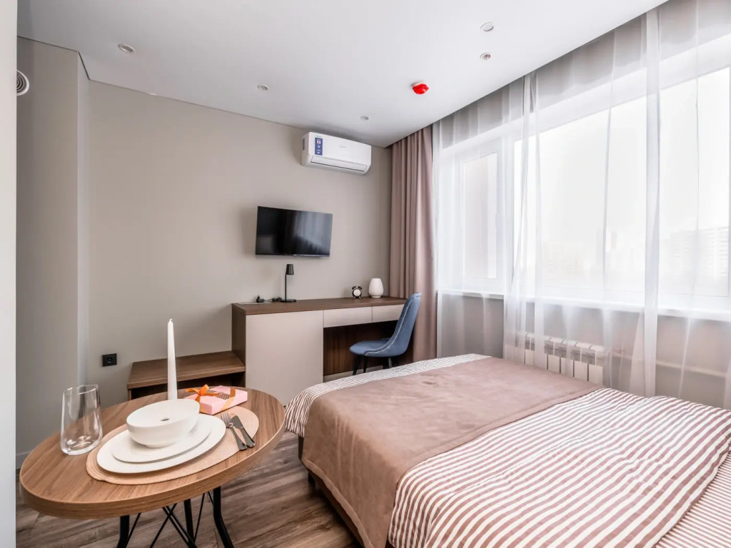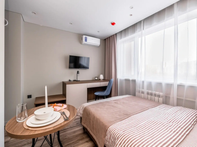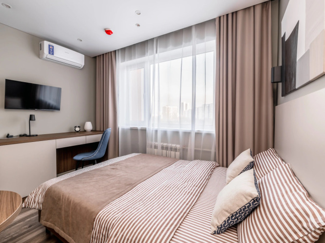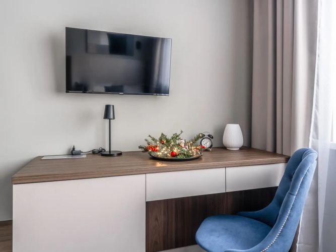 Номер уютно обставлен и оснащён необходимым, чтобы отдохнуть после долгого и насыщенного дня. Имеются телевизор. Оснащение зависит от выбранной категории номера.