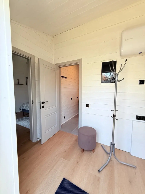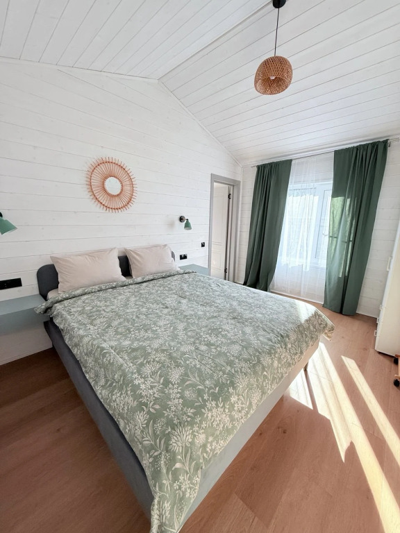 Двухкомнатный дом рассчитан на размещение до четырёх гостей. В наличии двуспальная кровать с постельным бельём, гостиная с диваном, на котором возможно организация двух дополнительных спальных мест. Кухня оснащена посудой и столовыми приборами, кофемашиной, микроволновой печью, холодильником и варочной панелью. В ванной комнате предоставляются полотенца. В распоряжении гостей Wi‑Fi, телевизор, терраса с мебелью, шезлонги и парковка на территории. Организовано видеонаблюдение на въезде на территорию.