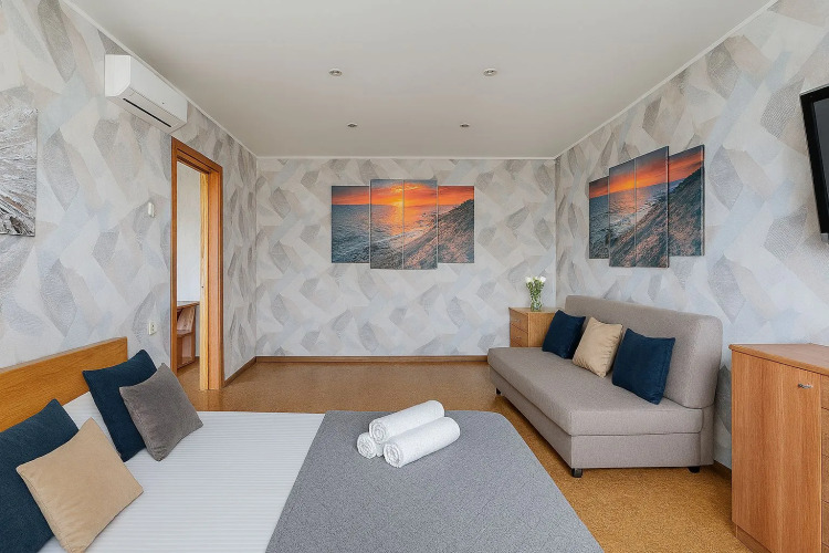 Номер уютно обставлен и оснащён необходимым, чтобы отдохнуть после долгого и насыщенного дня. Имеются телевизор. Оснащение зависит от выбранной категории номера.
