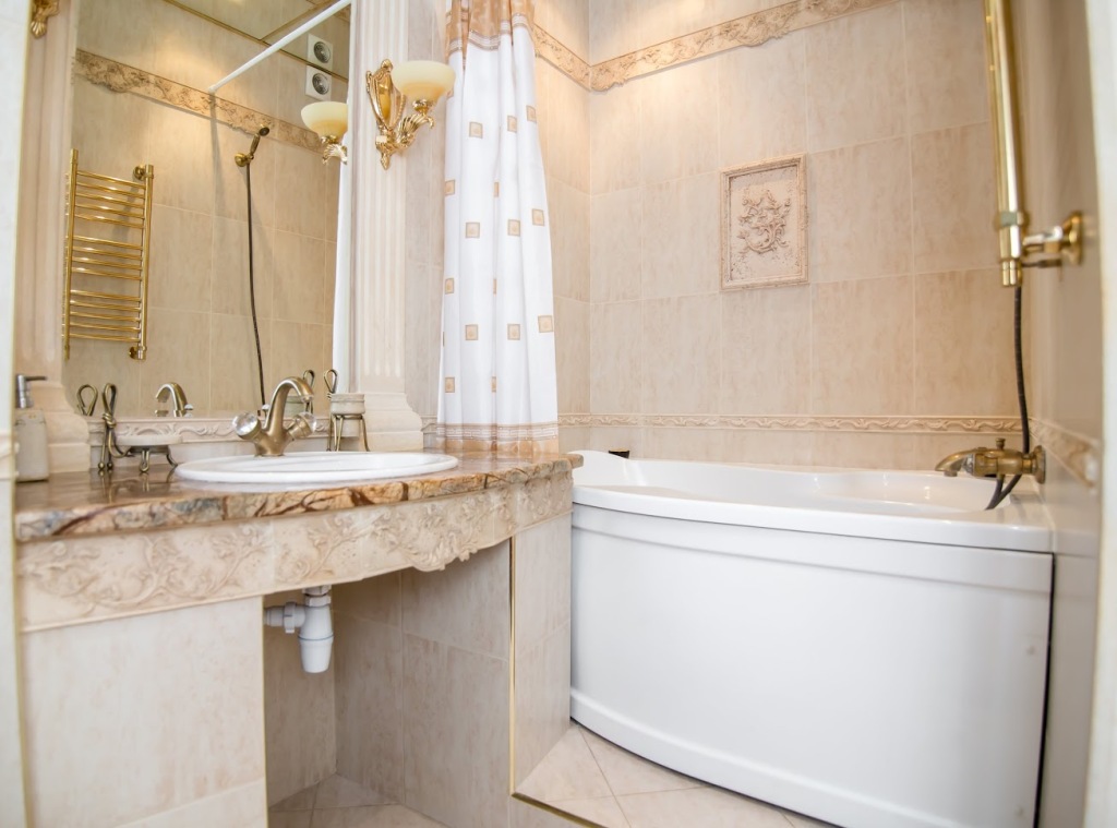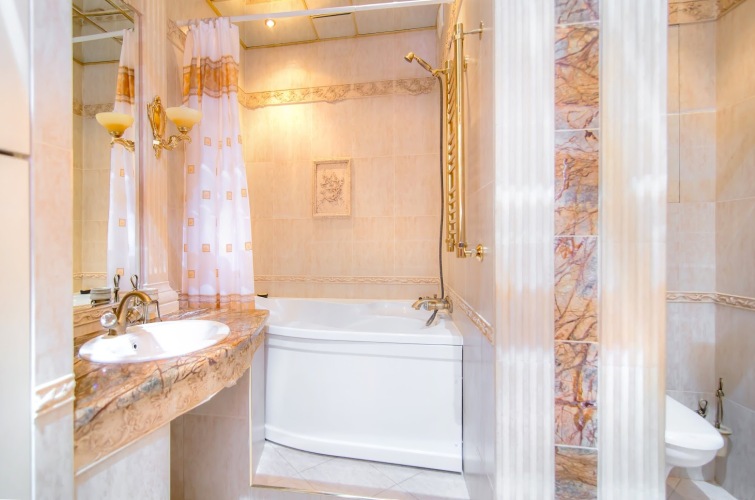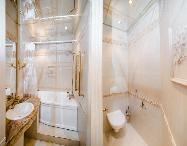 В ванной джакузи, фен, стиральная машина, водонагреватель, махровые полотенца по 2 штуки (большое и малое) для каждого человека, махровые халаты (индивидуально), шампунь, мыло, гель для душа, ватные диски и палочки, туалетные принадлежности, швейный набор. На кухне комплект посуды для сервировки и приготовления пищи; чай, кофе, сахар; бытовая техника: холодильник, плита, духовка, микроволновка, чайник, кофеварка, тостер.
