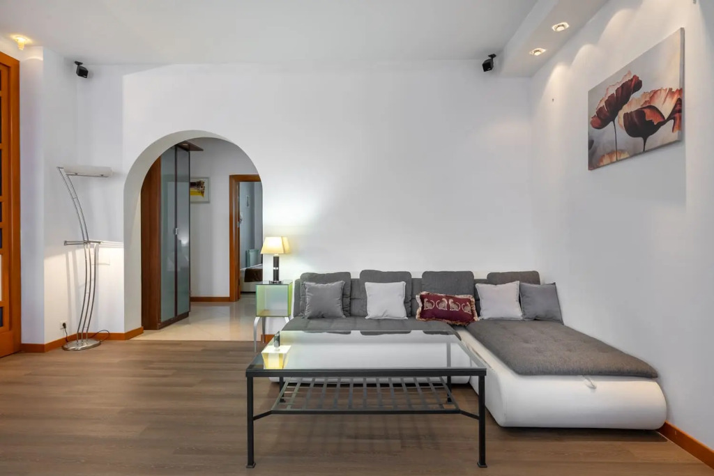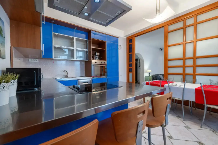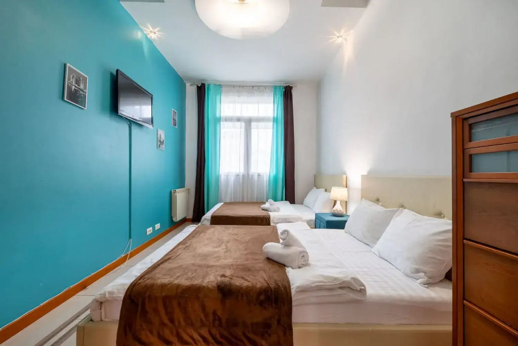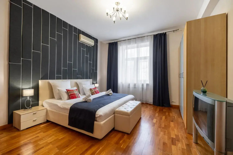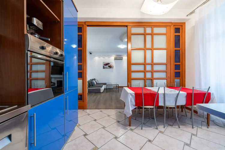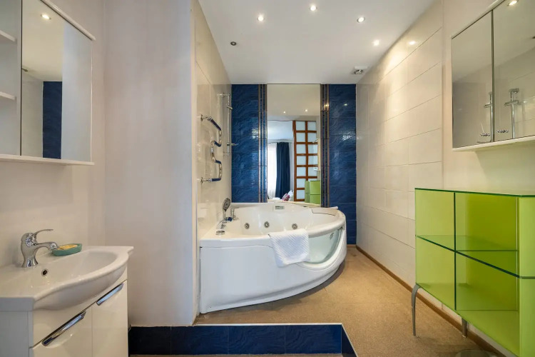 Комнаты: 3. Две изолированные спальни, проходной зал 42 кв.м. с роялем, кухня с выходом на балкон, две ванные – совмещённый санузел с душевой кабиной и ванная комната. Спальные места: 2+1,5+1,5+1,5+2. Кровать king-size с ортопедическим матрасом, две 1,5-спальные кровати, два двухместных раскладных дивана в гостиной. Максимальное количество гостей: 7. Площадь: 120 кв.м. Этаж: 7 этаж 7-этажного дома, есть лифт. Парковка: во дворе под шлагбаумом, включена в стоимость. В апартаментах есть кабельное ТВ, высокоскоростной WiFi, кондиционеры, утюг и гладильная доска, одноразовые тапочки. В спальнях ортопедические матрасы, бельё из сатина, шкаф-купе. В гостиной Smart TV, большие удобные диваны, журнальный столик, акустический рояль. На кухне комплект посуды для сервировки и приготовления пищи; чай, кофе, сахар; бытовая техника: холодильник, посудомоечная машина, плита, духовой шкаф, микроволновая печь, кофеварка, чайник, тостер. В ванных фен, махровые полотенца по 2 штуки (большое и малое) для каждого человека, махровые халаты (индивидуально), шампунь, мыло, гель для душа, ватные диски и палочки, туалетные принадлежности, швейный набор.