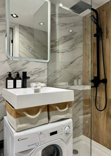 В апартаментах имеется двуспальная кровать 160x200 см. Имеется доступ к сети Wi-Fi. В распоряжении гостей холодильник, электрический чайник, электроплита, турка для приготовления кофе, стиральная машина, фен, утюг, гладильная доска и сушилка для одежды.