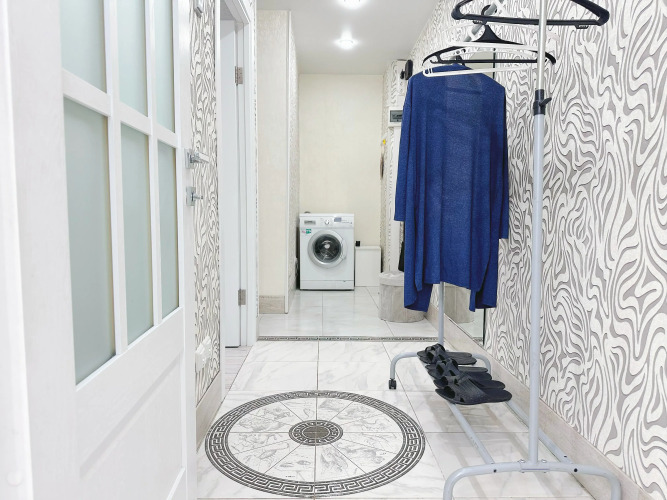 Квартира оснащена духовкой, СВЧ, чайником, плитой, холодильником и набором посуды на четырёх человек, а также шторами блэк-аут, ТВ и Wi-Fi.