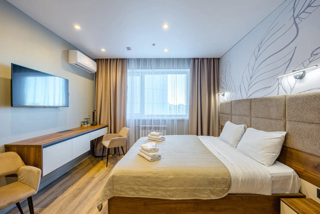 Номер уютно обставлен и оснащён необходимым, чтобы отдохнуть после долгого и насыщенного дня. Имеются телевизор. Оснащение зависит от выбранной категории номера.