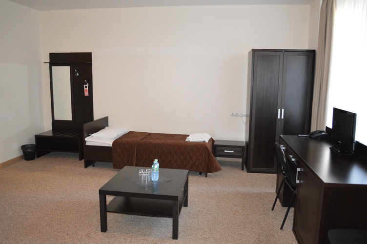 Однокомнатные номера данной категории рассчитаны на проживание одного гостя. Их оформление выполнено в современном стиле с использованием пастельных тонов, предусмотрен необходимый минимум удобств, в том числе цветной телевизор, телефон и бесплатный Wi-Fi доступ в интернет. Площадь каждого номера эконом-класса составляет до 12 кв. м. В ванной комнате установлена душевая кабина, санузел, предоставляется фен, комплект полотенец и набор туалетных принадлежностей.