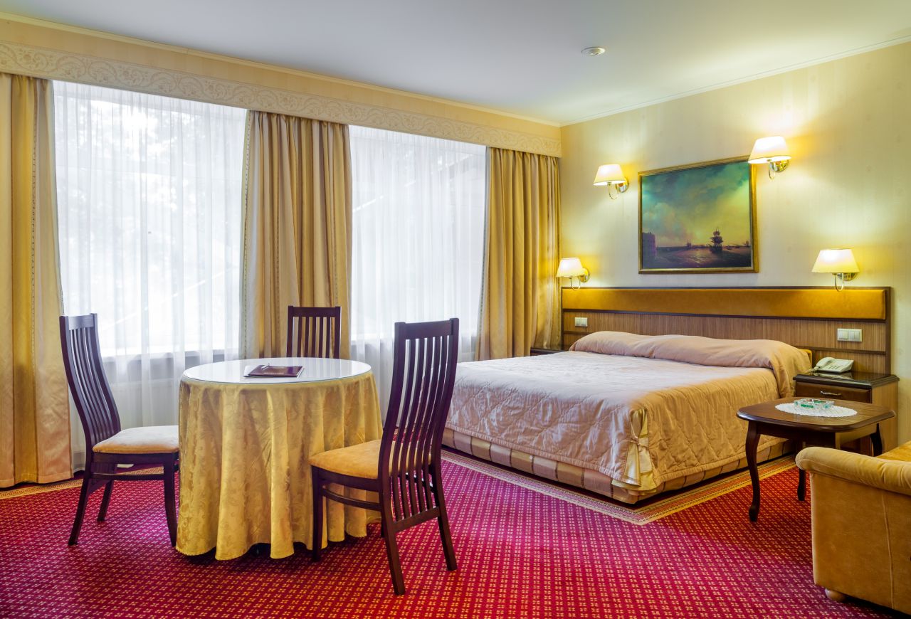 Номер «Люкс» — это изысканный современный интерьер, удобная мягкая мебель, обеденная и рабочая зоны и просторная ванная комната с джакузи. Размер номера: 39 м2. В номере: •электронная система контроля доступа в номер •индивидуальная сплит система для обеспечения свежего воздуха •звукоизоляционные окна и двери с глазком •ковровое покрытие •ортопедические матрацы и подушки •телефон с прямой международной линией •доступ в интернет (Wi-Fi, выделенный канал) •спутниковое телевидение
