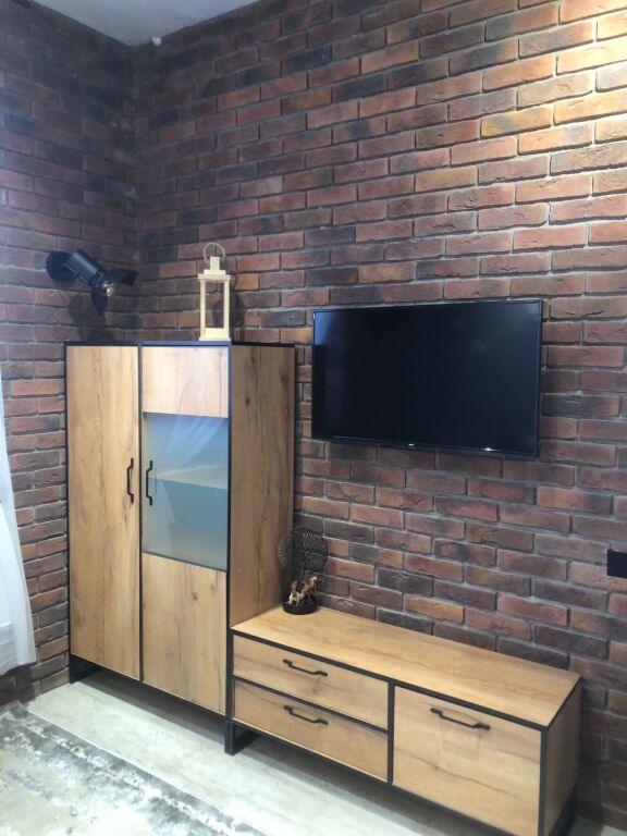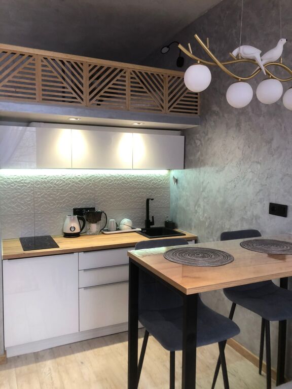 В апартаментах есть мебель, на втором этаже двуспальная кровать, диван-кровать с ортопедическим матрасом, необходимая бытовая техника, скоростной WI-FI, гладильная доска, утюг, сушка, оборудованная кухня, полный комплект посуды для приготовления и приёма еды, а также постельное бельё и полотенца на каждого гостя, шампунь, гель, мыло, фен.