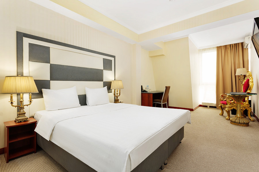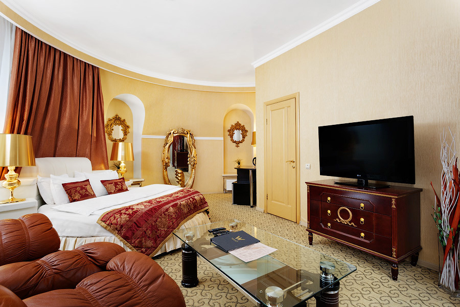 Просторные и уютные двухкомнатные или однокомнатные номера в тёплых золотисто-бежевых тонах общей площадью 37 кв. м, прекрасно подходят как для работы, так и для отдыха. Для гостей в номере имеется двухместная кровать 180*200 (King Size), плазменная панель, бесплатный доступ в интернет (Wi-Fi), спутниковое телевидение, рабочий стол, журнальный столик, мини-бар, багажная тумба. Ванная комната европейского стандарта оснащена ванной или душевой кабиной на выбор гостя, а также феном.