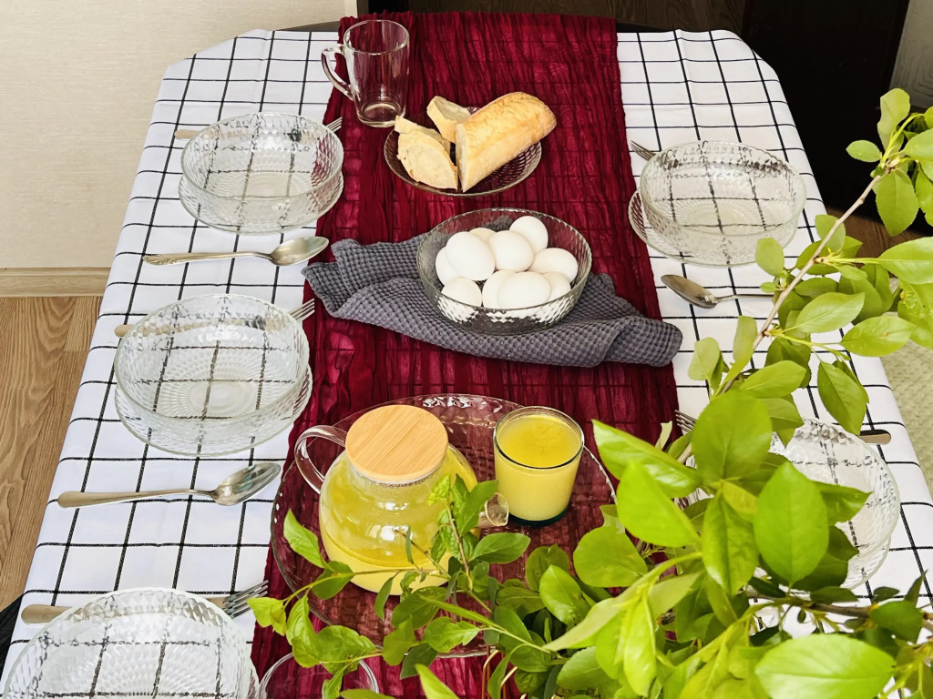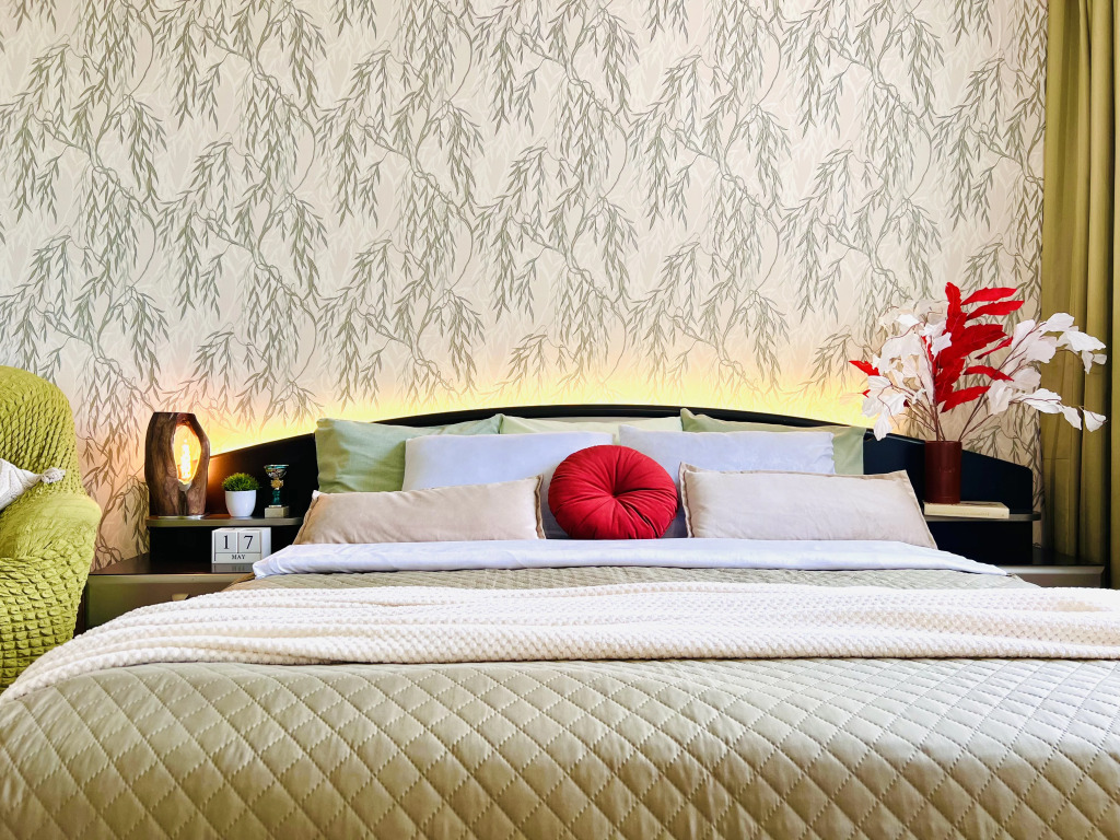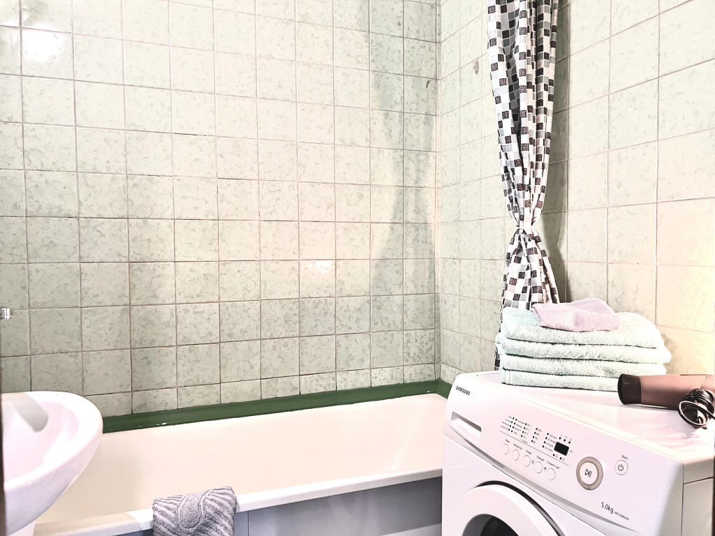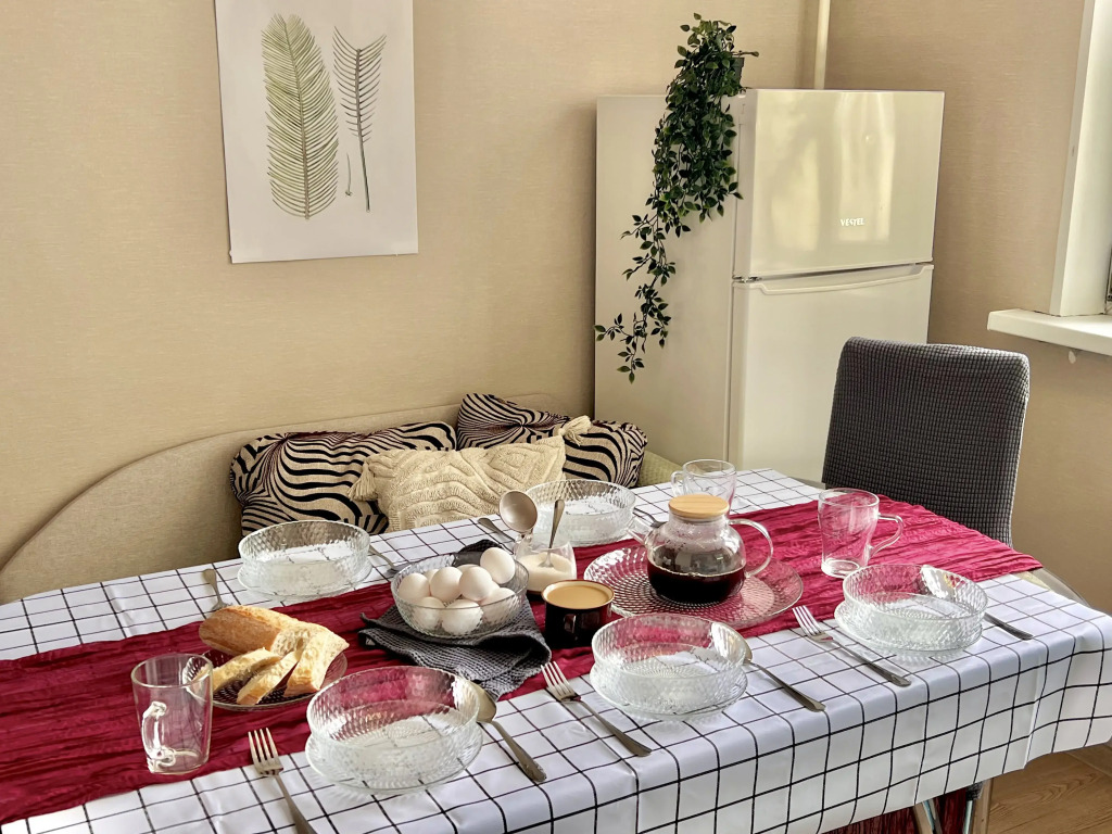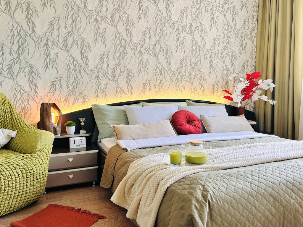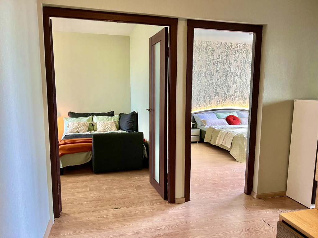 В двухкомнатной квартире могут разместиться до 8 человек. Гостям доступны: две двуспальные кровати с ортопедическими матрасами — 180 см х 200 см и 160 см х 200 см, двухместный диван, по согласованию предоставляется дополнительное спальное место. В спальне есть письменный стол. Кухонная зона оснащена электрической плитой, духовкой, холодильником, микроволновой печью, электрическим чайником, а также посудой, столовыми приборами, чаем, кофе, сахаром и маслом. Для гостей предоставляются стиральная машина, гладильная и сушильная доски, фен, утюг. По запросу бесплатно предоставляется детский стульчик. Гостям доступны постельное бельё, полотенца, средства личной гигиены, Wi-Fi, цифровое телевидение с 100 каналами.