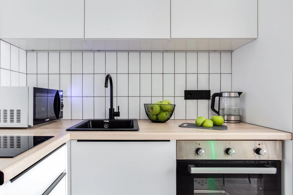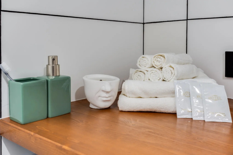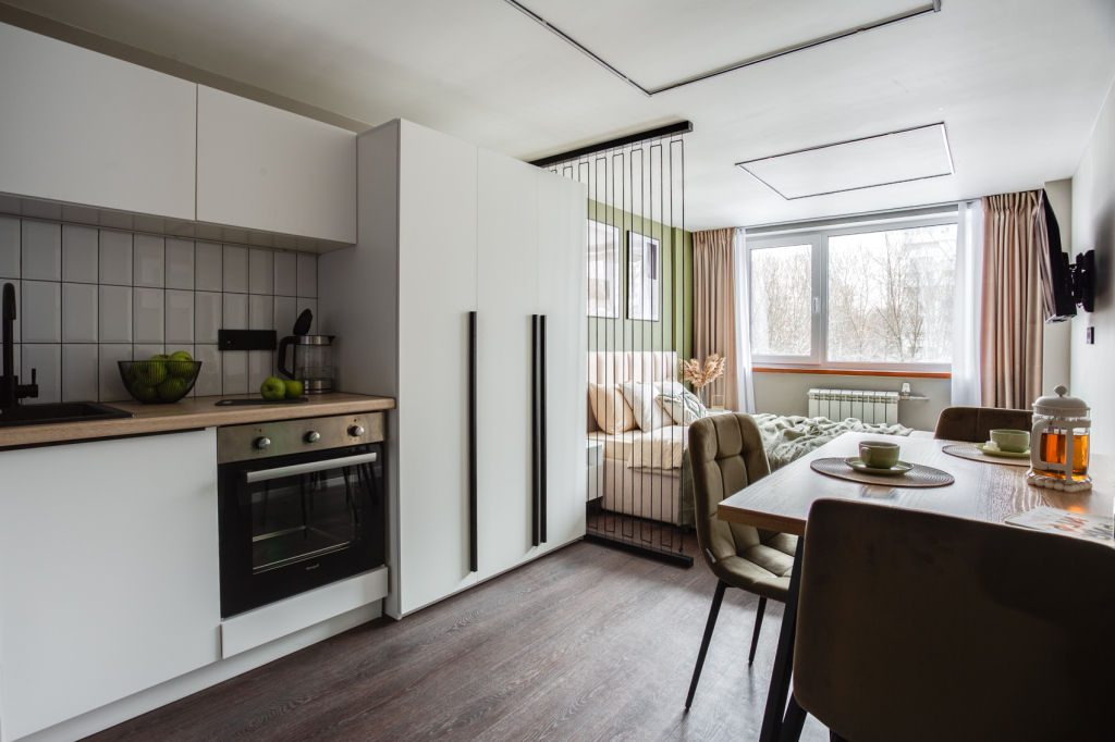 Комплекс апартаментов состоит из двух студий, в каждой из которых своя кухня и ванная комната. Максимальное количество гостей — 3. Третье спальное место на раскладушке с матрасом, которая выдается при наличии 3 гостей.