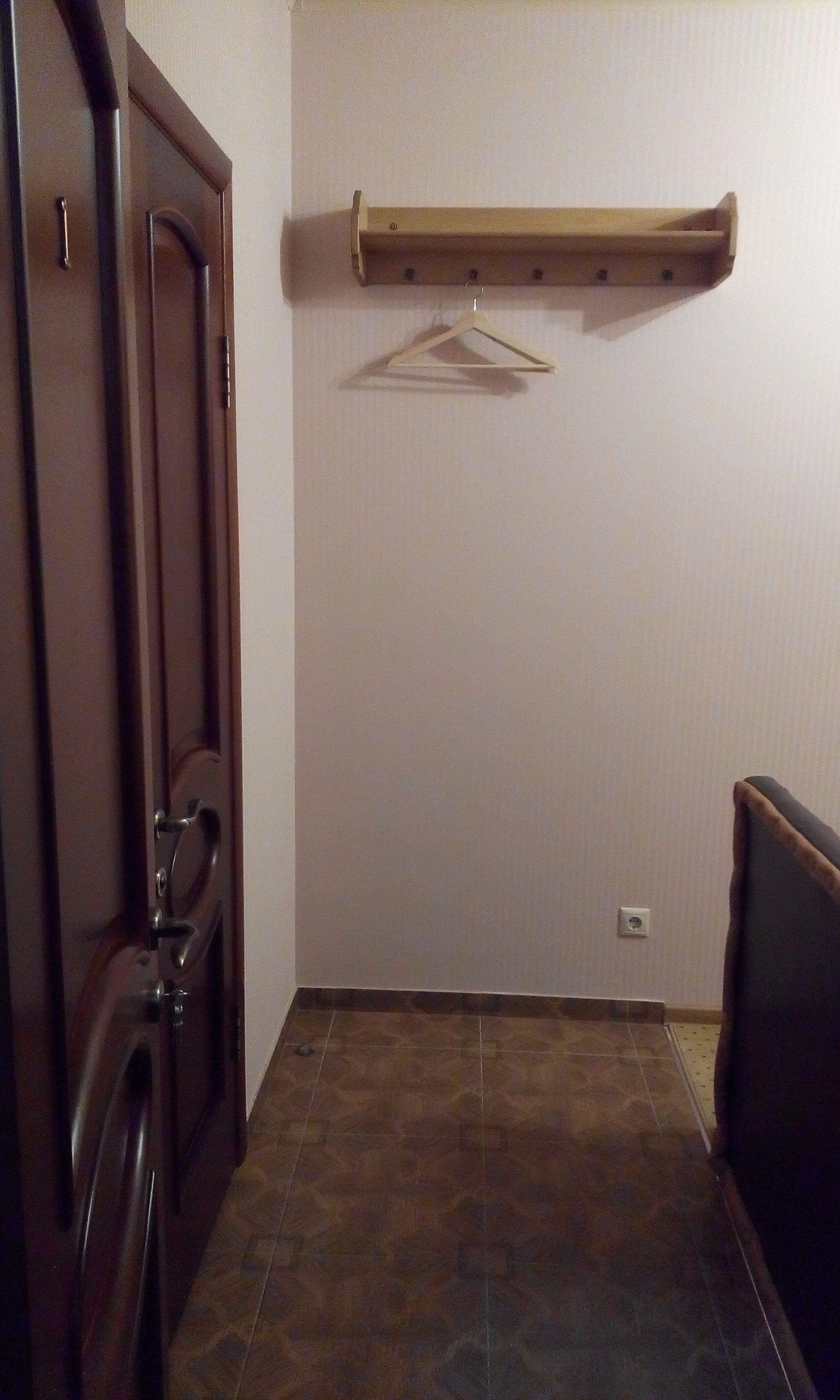 Вход в хостел с внешней стороны улицы. Темная пластиковая дверь. Есть отдельная кнопка для звонка администратору.