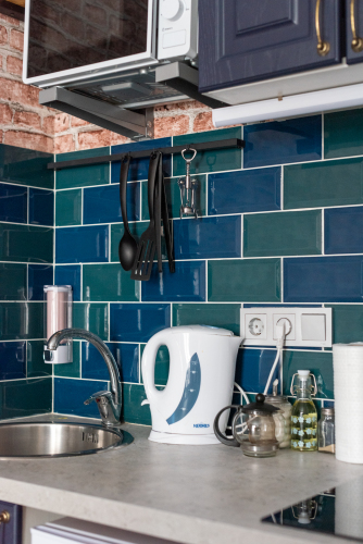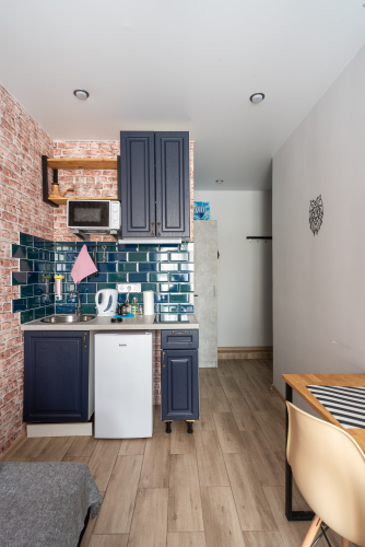 На кухне есть встроенная электроплита, вытяжка, микроволновая печь, холодильник, посуда для приготовления и сервировки стола. Минимальный набор продуктов, таких как масло, соль, перец, сахар, макароны.