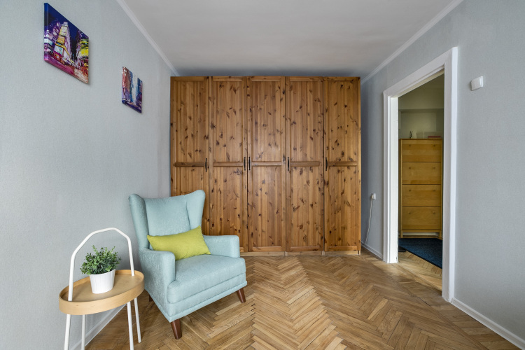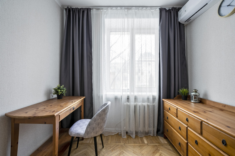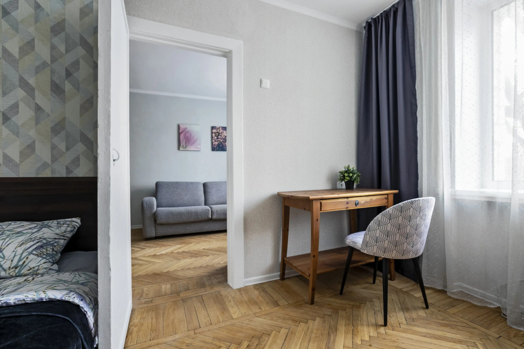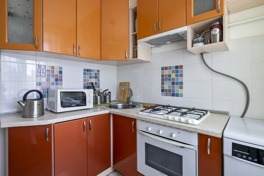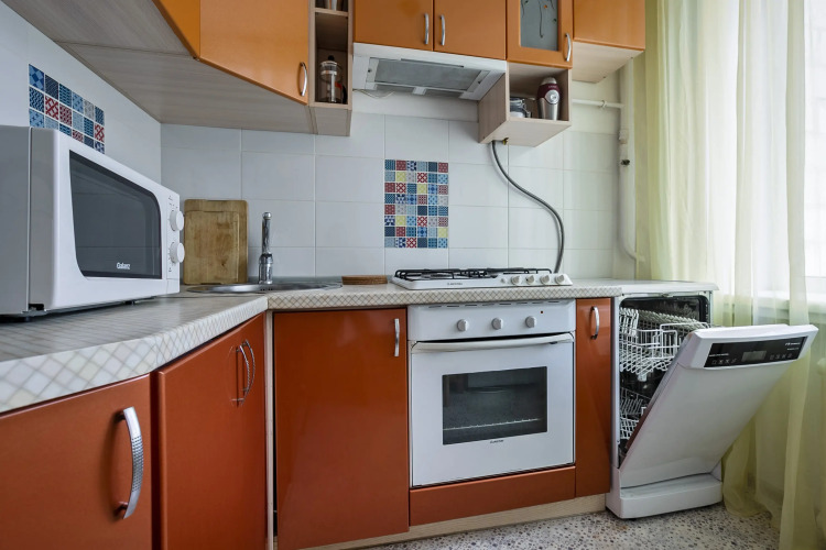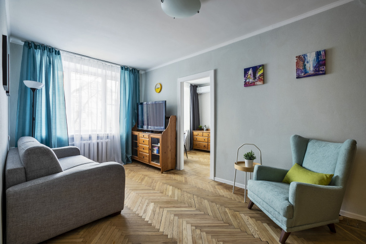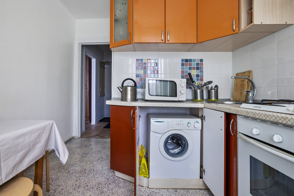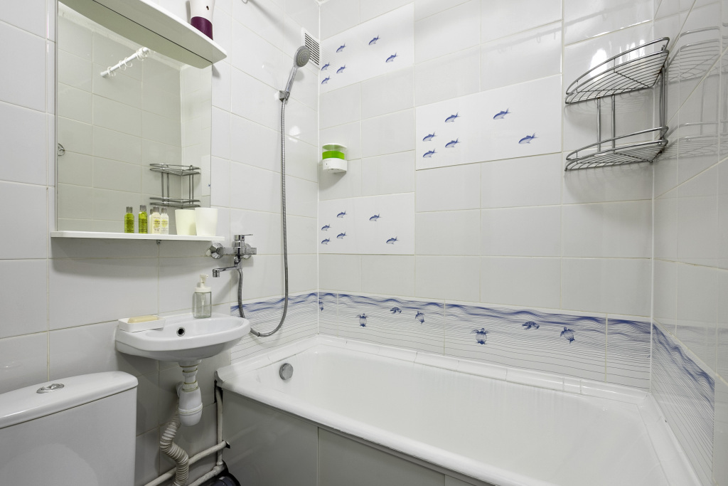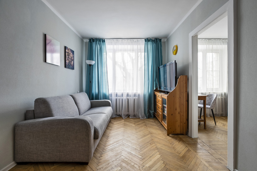 В квартире есть необходимое для размещения 4 гостей: Wi-Fi, ванна, стиральная машина, кондиционер, фен, утюг, электрический духовой шкаф, комплект посуды, двуспальная кровать, раскладной диван, телевизор.