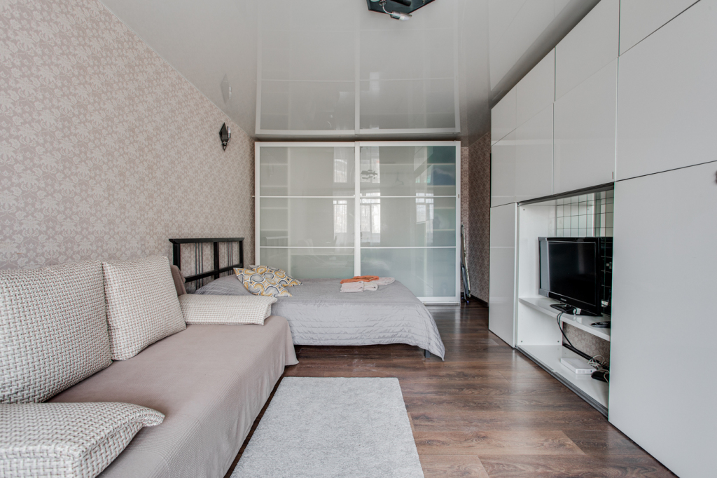 В квартире 4 спальных места: двуспальная кровать и двуспальный диван.