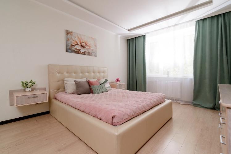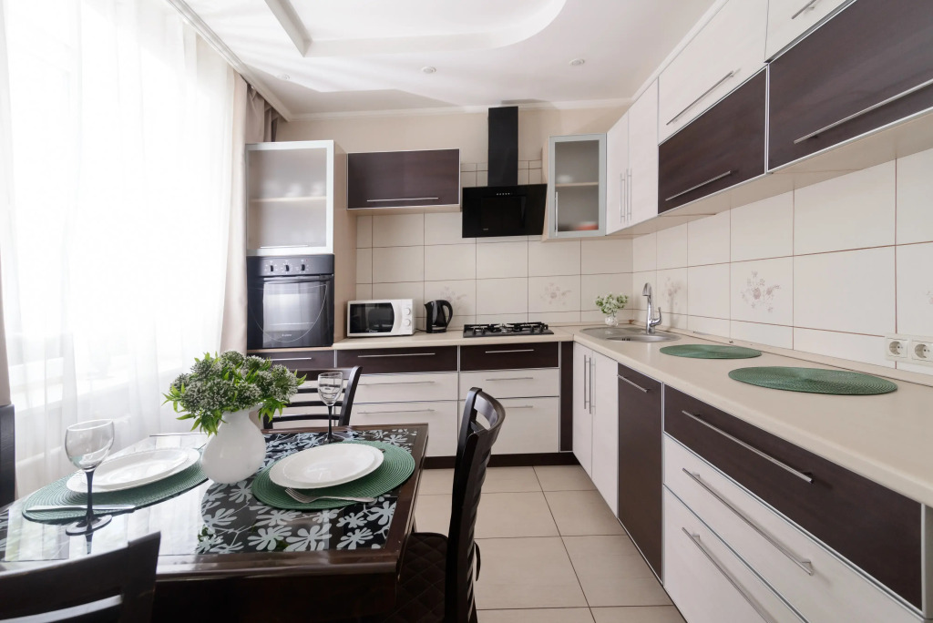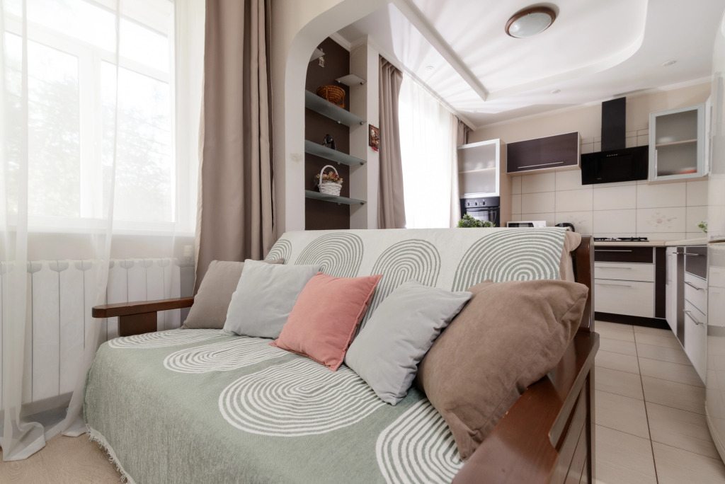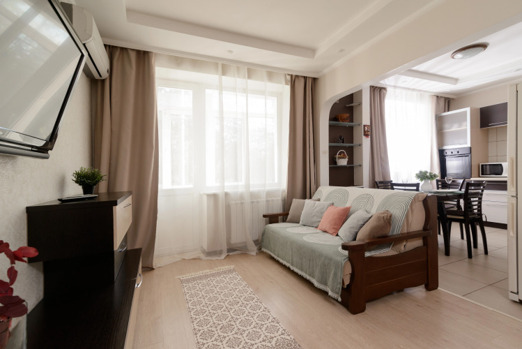 Возможно размещение до 4 гостей. В апартаментах есть двуспальная кровать 160×200 см, двухместный раскладной диван, кондиционер, телевизор, Wi‑Fi. В гостям предоставляются подушки, одеяла, постельное бельё и полотенца. Квартира оборудована шкафами и гардеробом. На кухне установлены газовая плита, духовой шкаф, посуда, большой холодильник, микроволновая печь, посудомоечная и стиральная машины, электрический чайник.