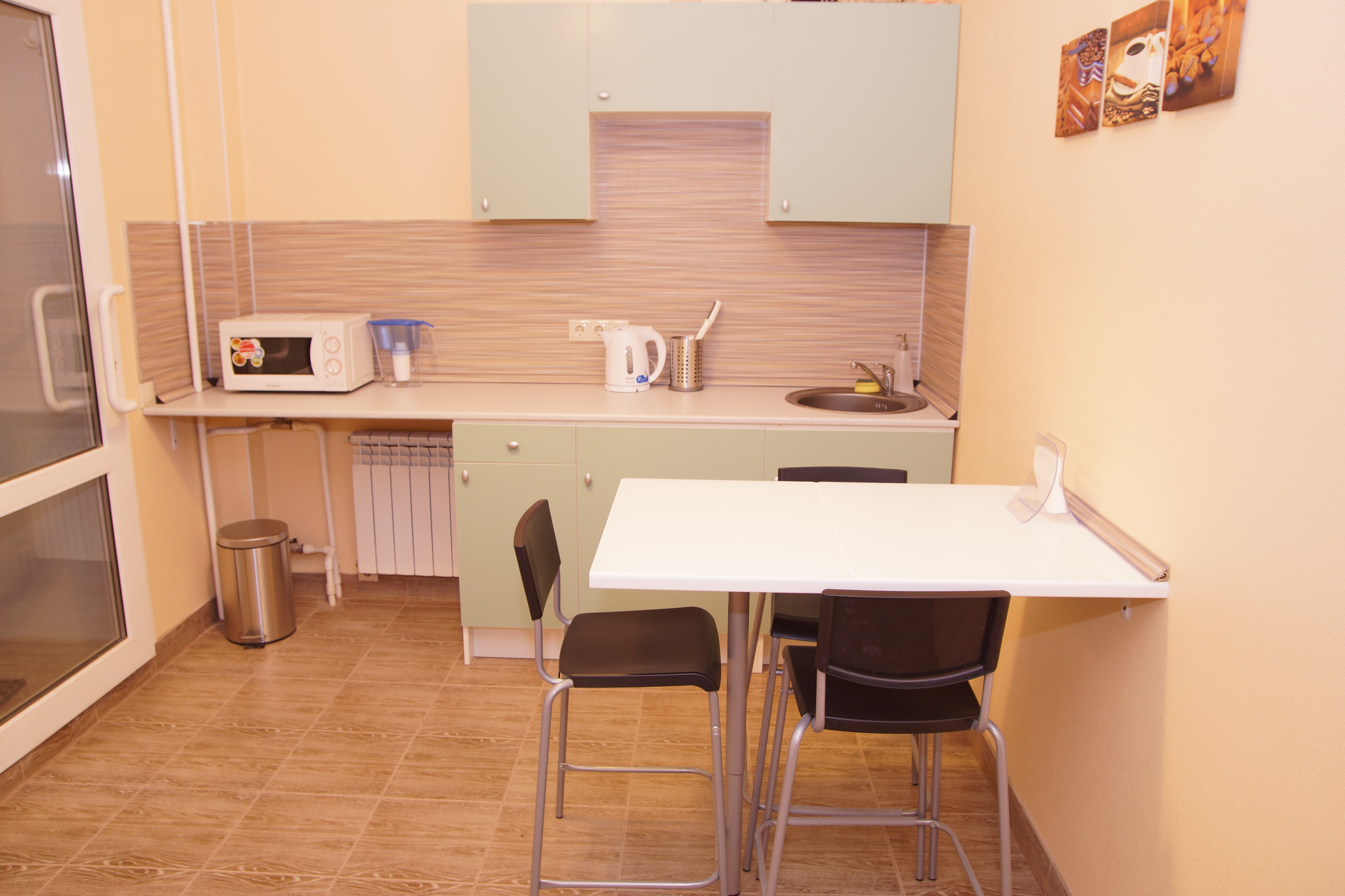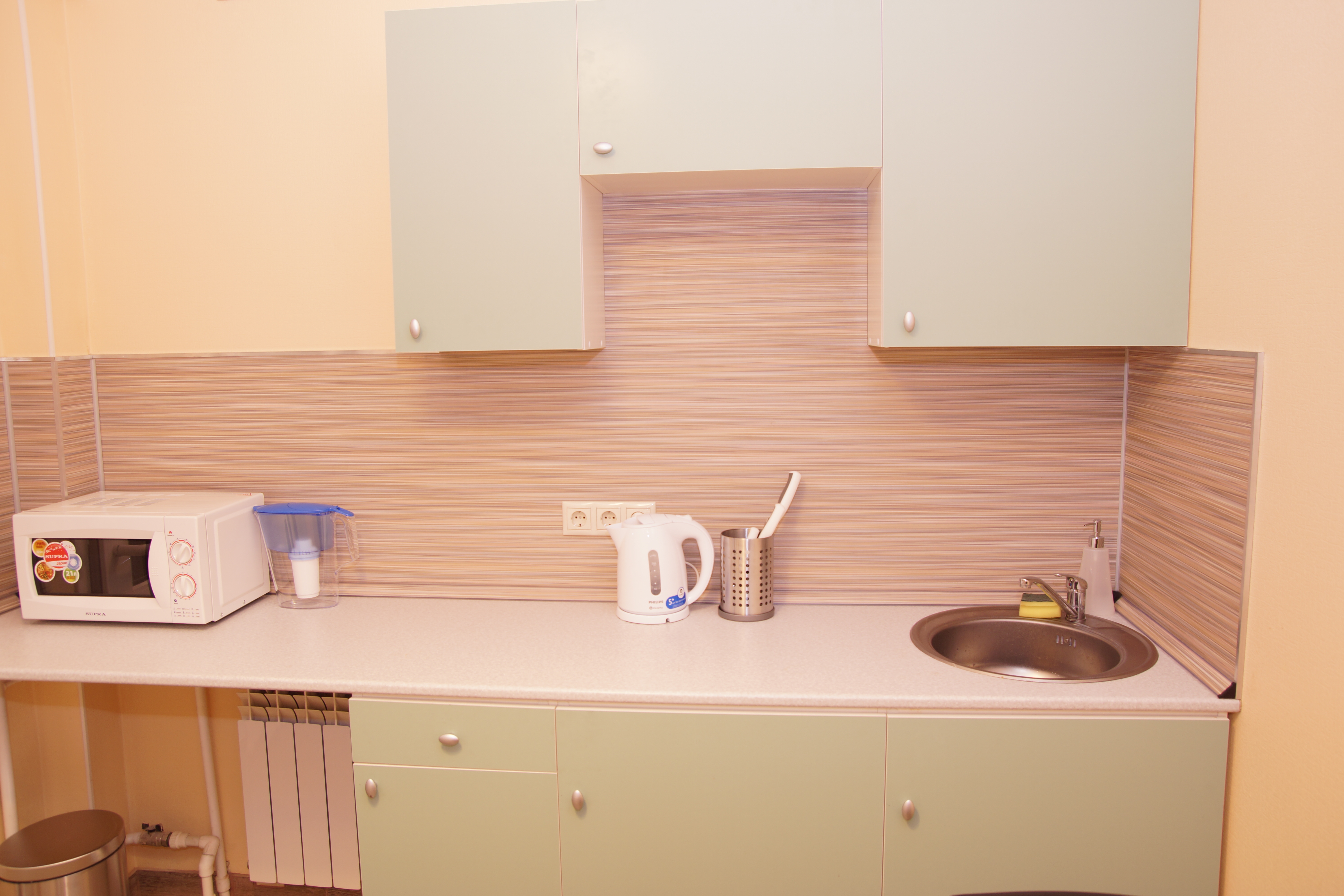 Общая кухня: холодильник, микроволновка, электрический чайник, посуда.