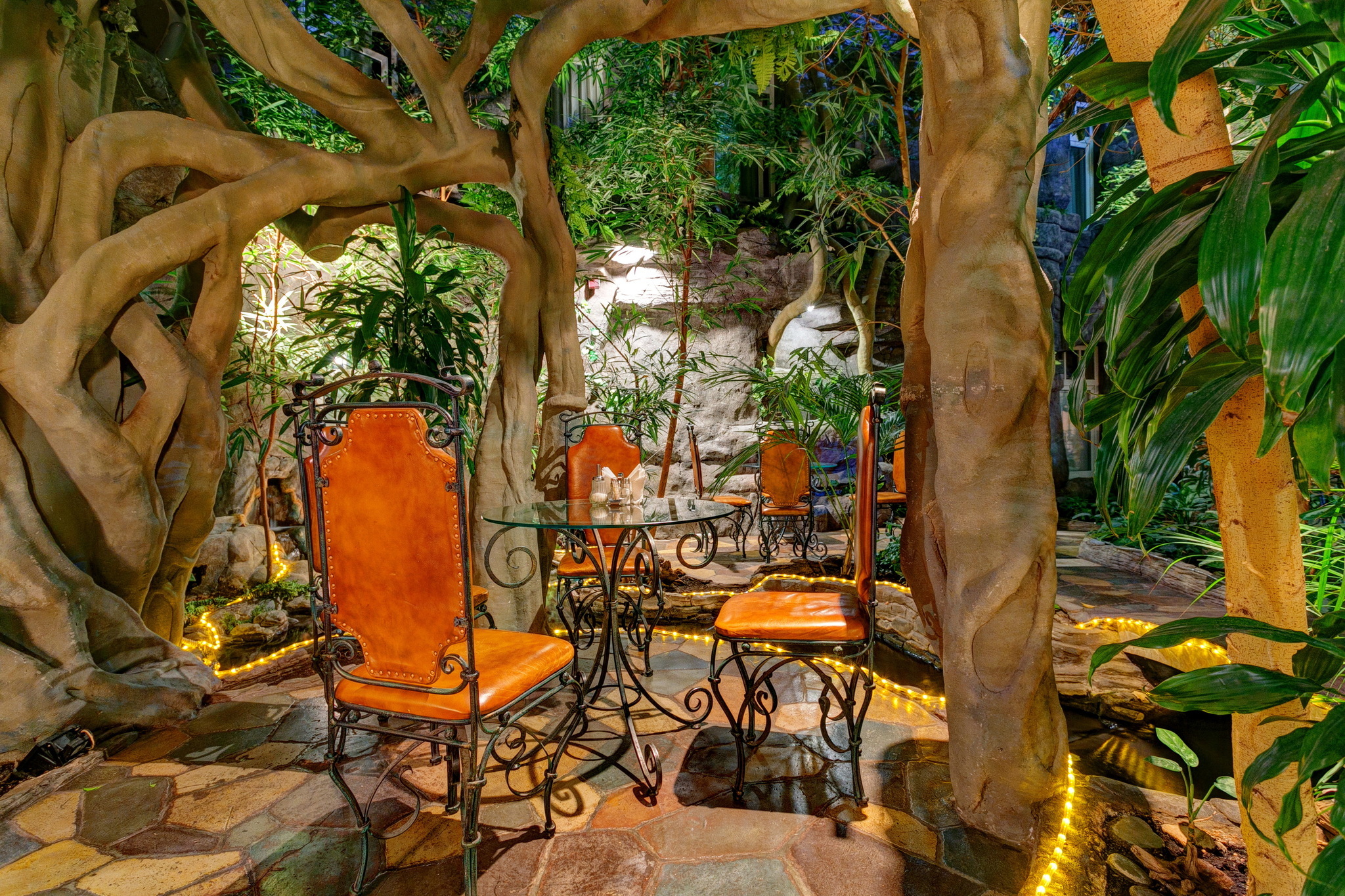 Вы будете поражены Зимним Садом, в котором Вы сможете насладиться прекрасным видом живых экзотических растений, увидеть как лианы сплетаются в едином ансамбле, где рядом водопад в человеческий рост. Вы стоите и смотрите на ручей, наблюдаете за черепахами и наслаждаетесь видом неторопливо плывущего сома. Для Вашего удобства в саду всегда стоят кованые кресла и уютные столики, Вы можете провести здесь как романтический ужин, так и деловые переговоры.