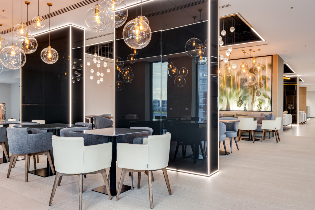 В здании на 13 этаже есть зона отдыха с диванами и креслами, зона коворкинга для работы и переговоров, кафе-бар, открытая терраса и спортивный зал. Парковка – возможна в подземном или многоуровневом паркинге торгового центра.