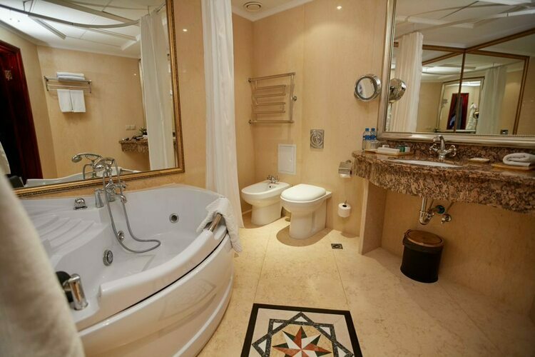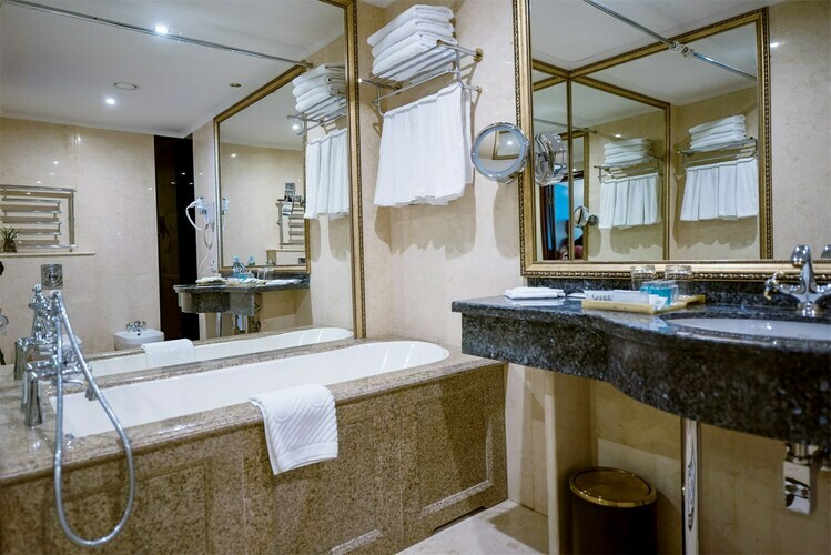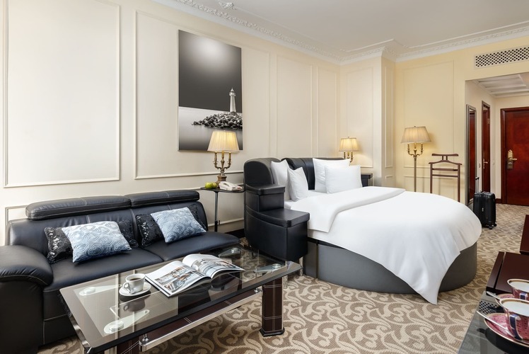 Насладитесь панорамным видом из великолепных номеров «Делюкс с балконом». В номере имеется спальня, гостиная зона, просторный рабочий стол, ванная комната с отделкой из итальянского мрамора с душевой кабиной либо ванной. Тип кровати: круглая.