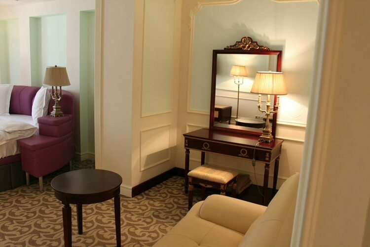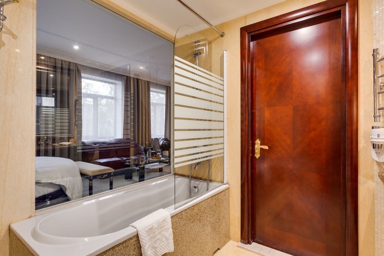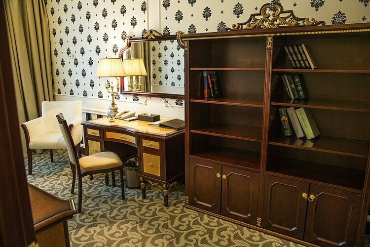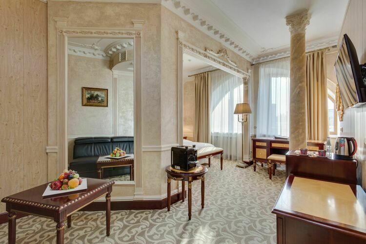 Великолепные апартаменты общей площадью до 60 квадратных метров представлены в классическом дизайне. Пространство гостиной удачно разделено на комфортную зону отдыха и рабочий кабинет. Для Вашего безупречного отдыха номер располагает спальней с двумя двуспальными кроватями, просторной гостиной, удобной рабочей зоной, ванной комнатой с ванной, биде и двумя раковинами, и видом на Николоямскую улицу. Идеальный вариант для длительного семейного проживания