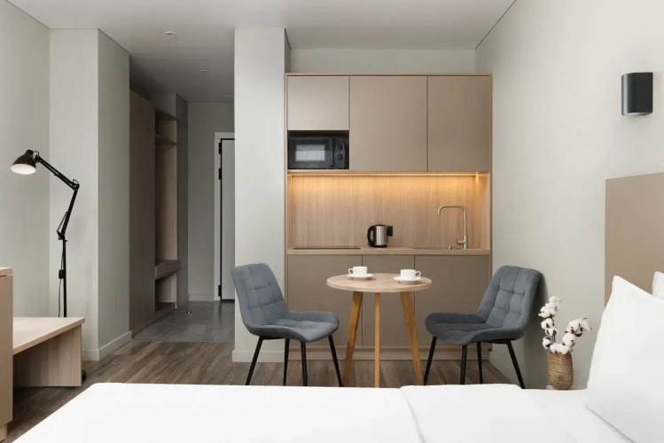 95 апартаментов оборудованы собственной кухней, электрической плитой, бытовой техникой, посудой и столовыми принадлежностями для проживания. Ванная комната оборудована душевой кабиной, феном, косметическими и гигиеническими средствами.
