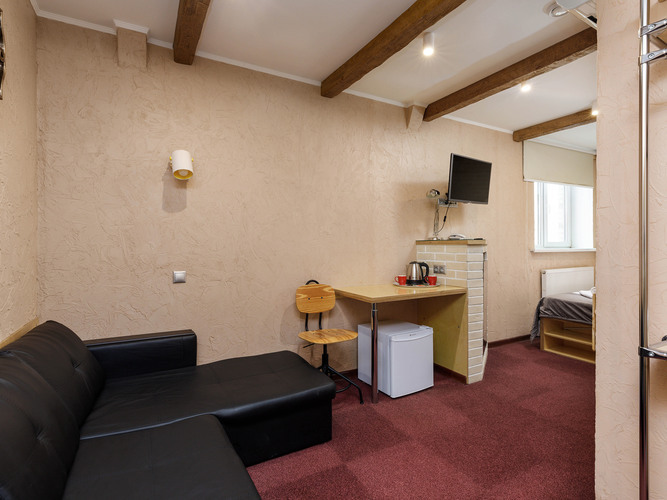 Стильный номер с камином для любителей современного дизайна с элементом домашнего тепла и уюта. В организации пространства прослеживаются прямые линии и лаконичность. К услугам гостей удобная двуспальная кровать, мягкое пастельное белье, тапочки и полотенца, прикроватное освещение, плотные ролл-шторы и большой раскладывающийся диван.. В номере есть камин, кондиционер, сейф, бесплатный WI-FI, телевизор с плоским экраном, DVD, электрочайник, мини-холодильник, набор посуды, чайный набор и ваза для