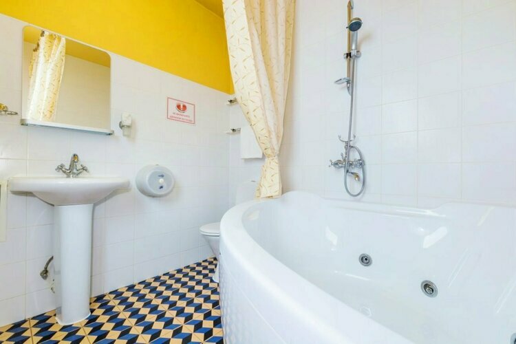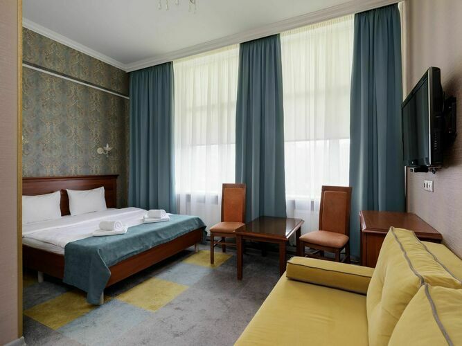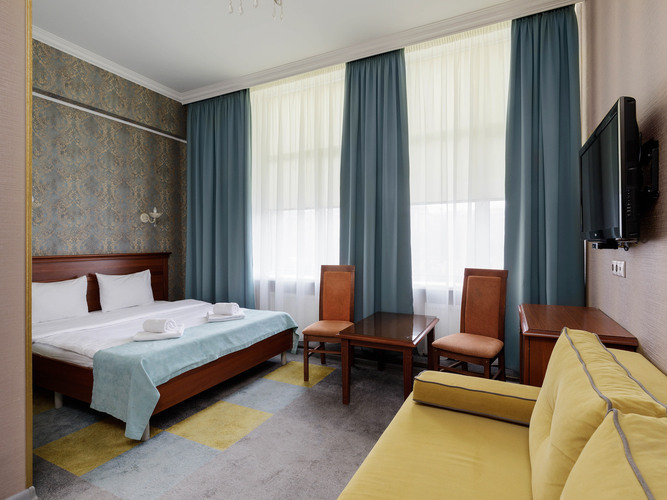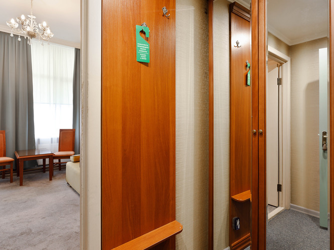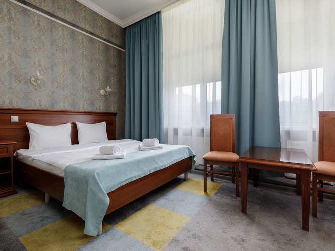 Просторный номер с ванной-джакузи, гостевой зоной и прихожей. Дизайн выполнен в классическом стиле, наполнен эстетикой и практичностью в организации пространства. Номер располагает всем необходимым для Вашего комфортного отдыха и работы. К услугам гостей: кондиционер, сейф, бесплатный WI-FI, рабочее пространство, зеркало, ЖК телевизор, электрочайник, мини-холодильник, набор посуды, чайный набор. Ванна с джакузи сделает ваш отдых особенным и незабываемым, в дополнение - мягкие полотенца и фен.