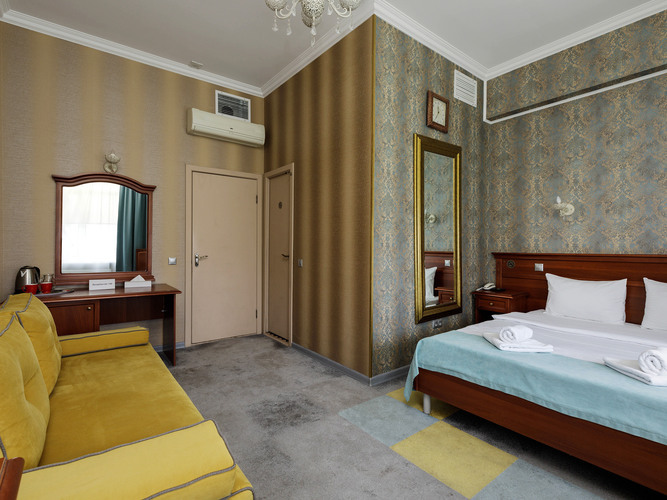Просторный номер с ванной-джакузи и гостевой зоной с диваном. Дизайн выполнен в классическом стиле, наполнен эстетикой и практичностью в организации пространства. К услугам гостей: кондиционер, сейф, бесплатный WI-FI, рабочее пространство, 2 больших зеркала, ЖК ТВ, электрочайник, мини-холодильник, набор посуды, чайный набор. Двуспальная кровать с удобным матрасом и мягким пастельным бельем, тапочки и полотенца, ванна с джакузи, полотенца и фен. Максимальная вместимость номера до 3 гостей.