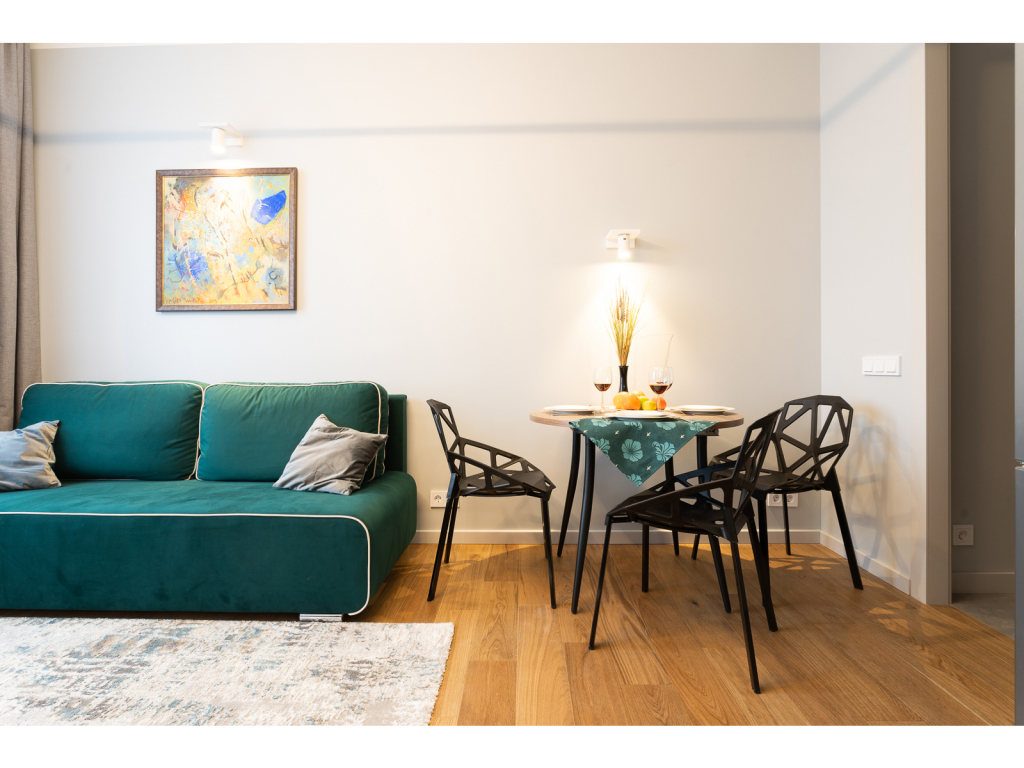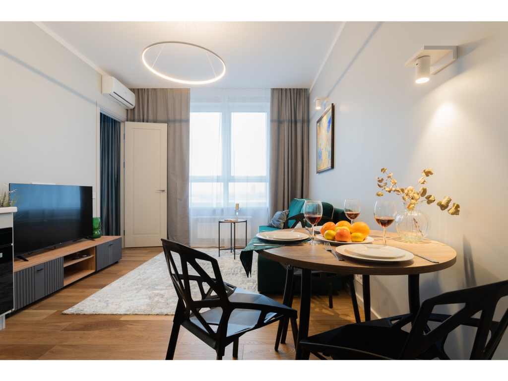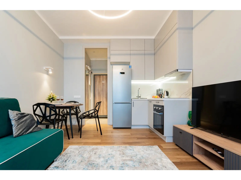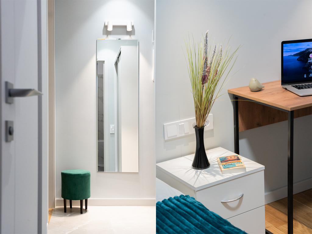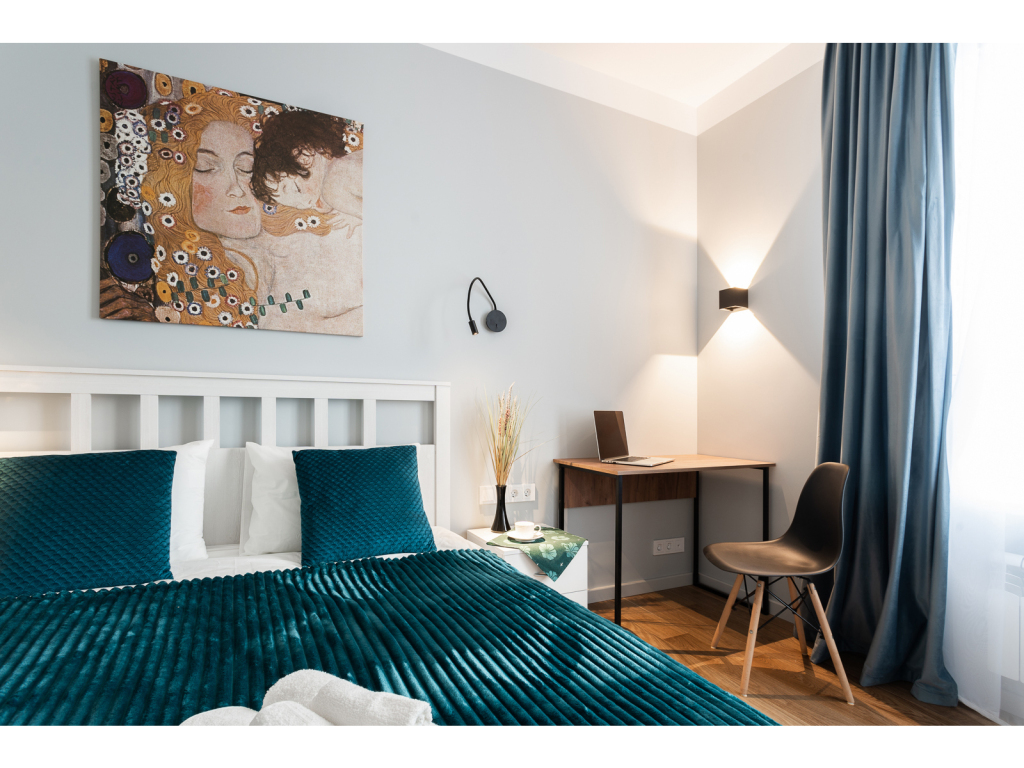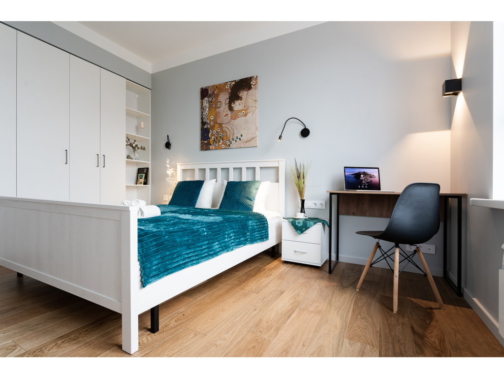 К услугам гостей двуспальная кровать с ортопедическим матрасом и раскладной диван на 2 спальных места укомплектованный дополнительным матрасом. Предоставляется постельное бельё. В спальне есть рабочий стол. На окнах шторы блэкаут. Есть Wi-Fi.