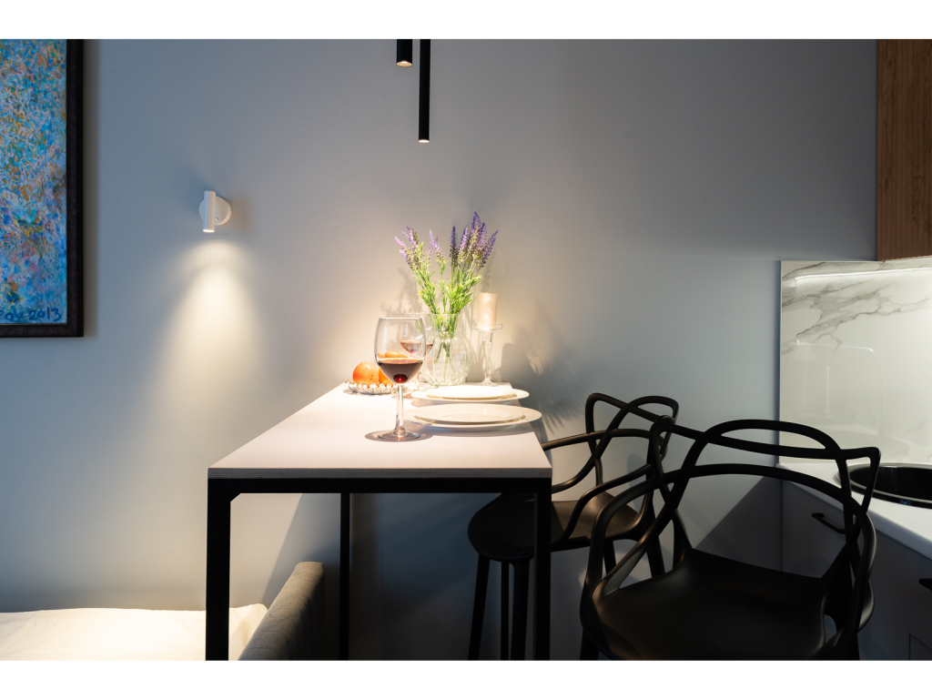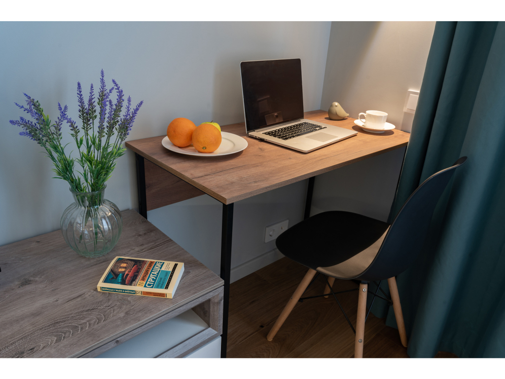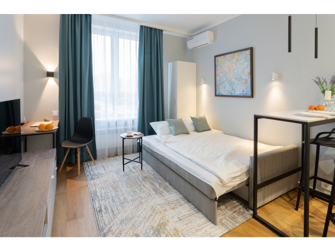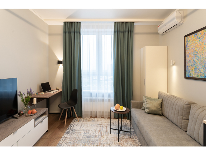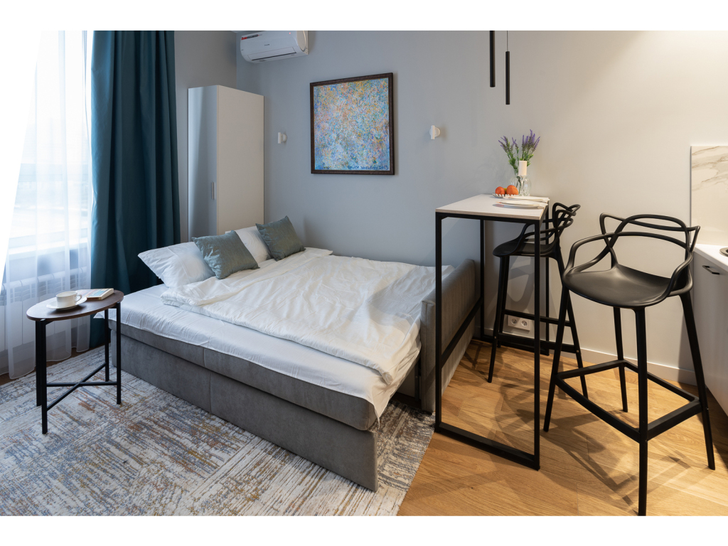 К услугам гостей раскладной диван с ортопедическим матрасом на два спальных места и дополнительная раскладная кровать. Предоставляется постельное бельё. В спальне есть рабочий стол. На окнах шторы блэкаут. Есть Wi-Fi.