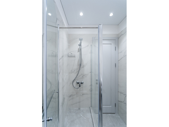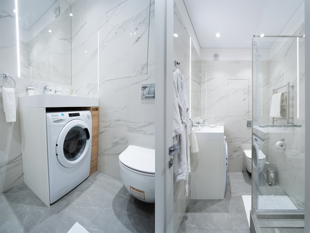 Ванная комната оснащена душем, унитазом, умывальником и стиральной машиной.