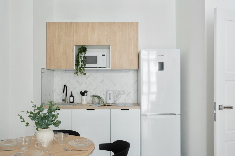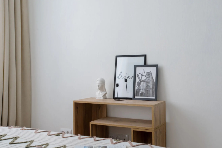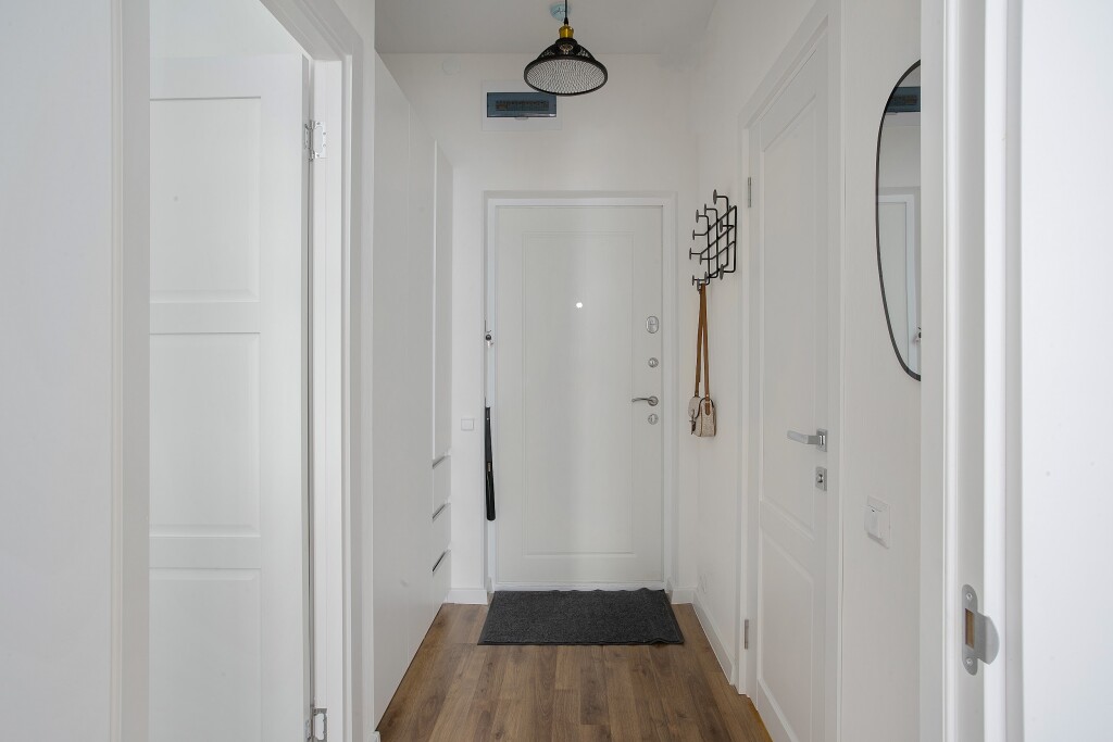 Площадь включает изолированную спальню, кухню-гостиную, застеклённую лоджию. Интерьер выполнен в скандинавском стиле.