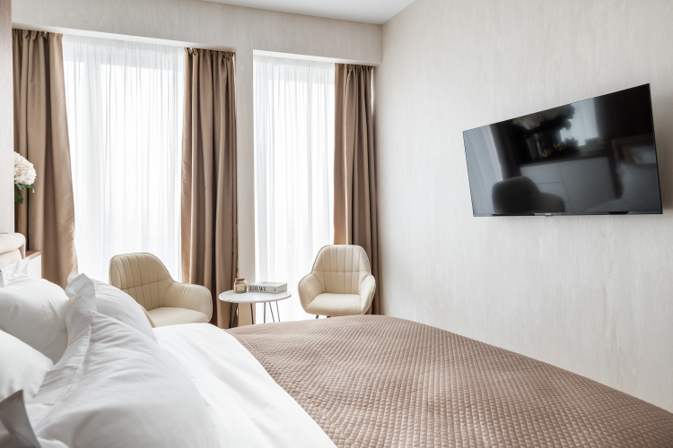 В номере вы найдёте телевизор и халат. Оснащение зависит от выбранной категории номера.