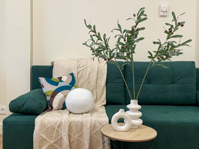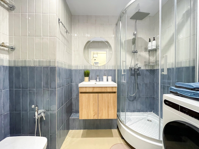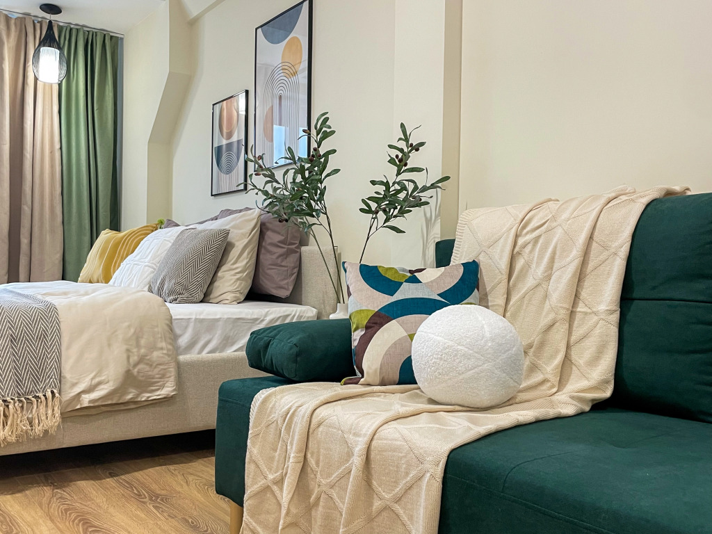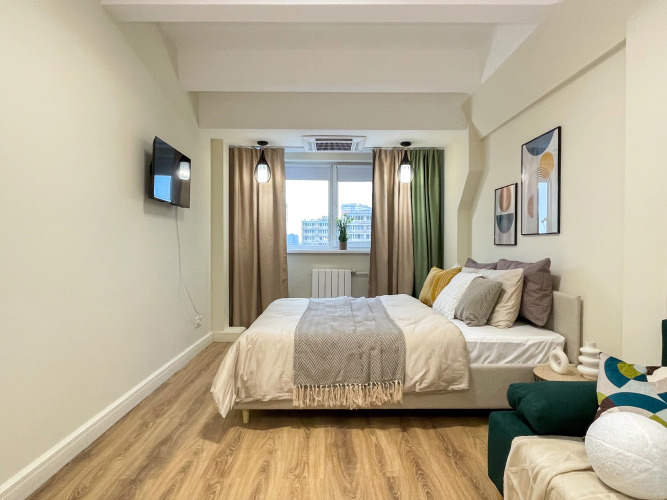 В студии есть необходимое для комфорта гостей: двуспальная кровать, раскладной двухместный диван, шкаф для одежды, стол и стулья, кухня с электрической плитой, холодильником, микроволновой печью; стиральная машина с сушкой, телевизор, бесплатный интернет, кондиционер.