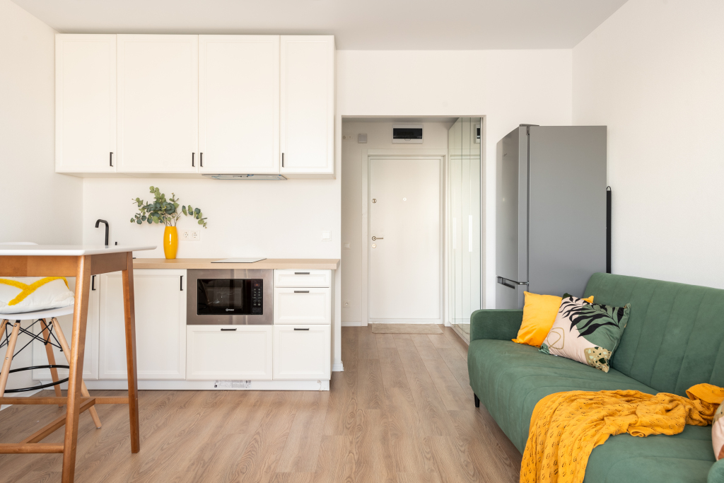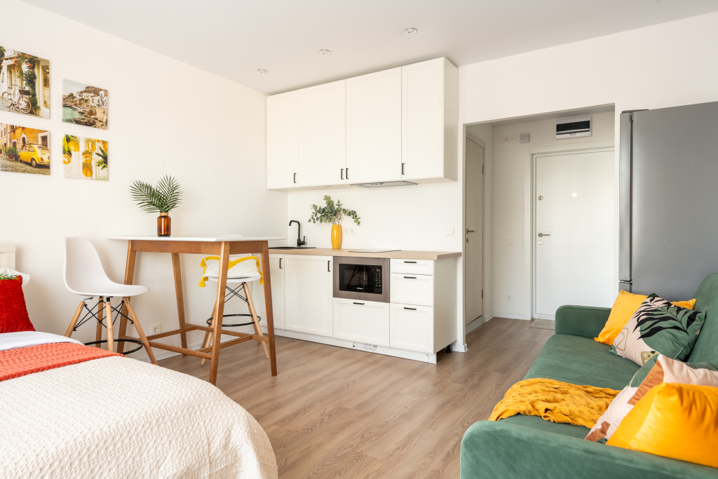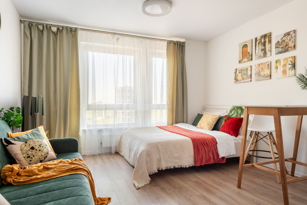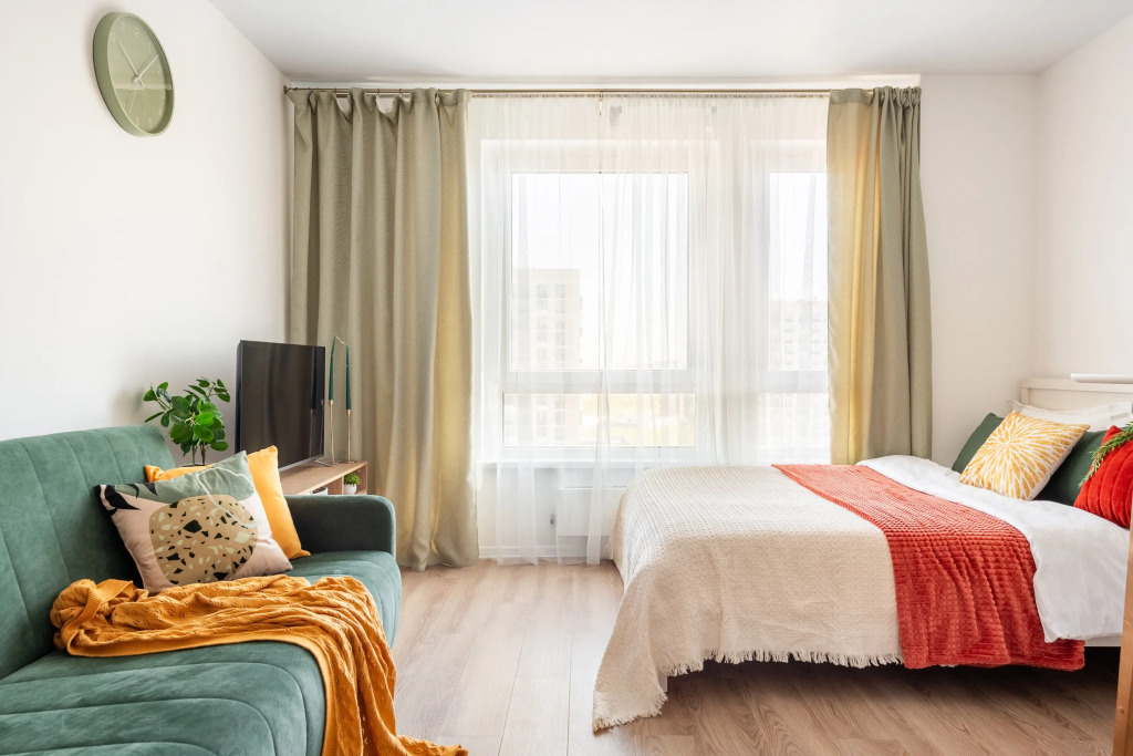 Квартира подходит для проживания 3 гостей. В наличии мультимедиа: Wi-Fi, телевизор смарт ТВ. Бытовая техника: холодильник, плита, фен, утюг, стиральная машина, СВЧ, вентилятор. Дополнительно предоставляются полотенца, постельное бельё, средства личной гигиены, комплект посуды и столовых приборов. Удобства: кровать с шторами блэк-аут, раскладной диван.