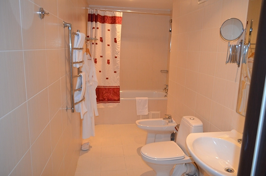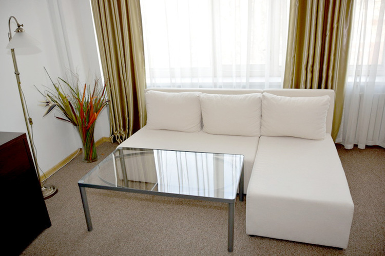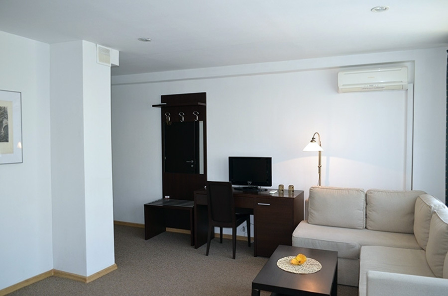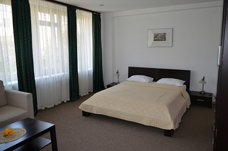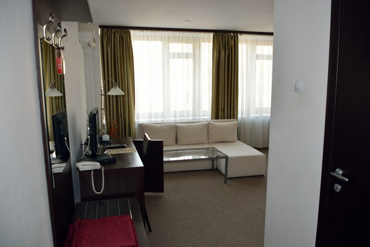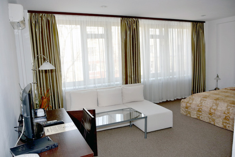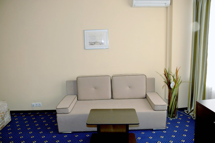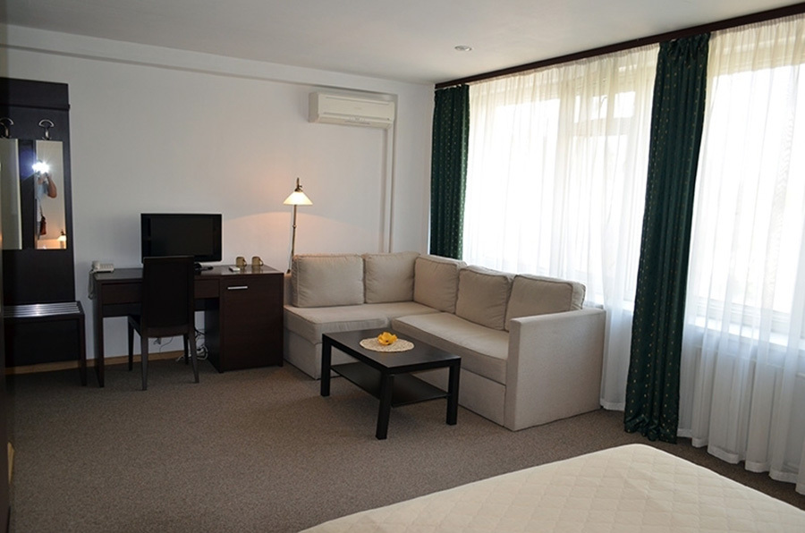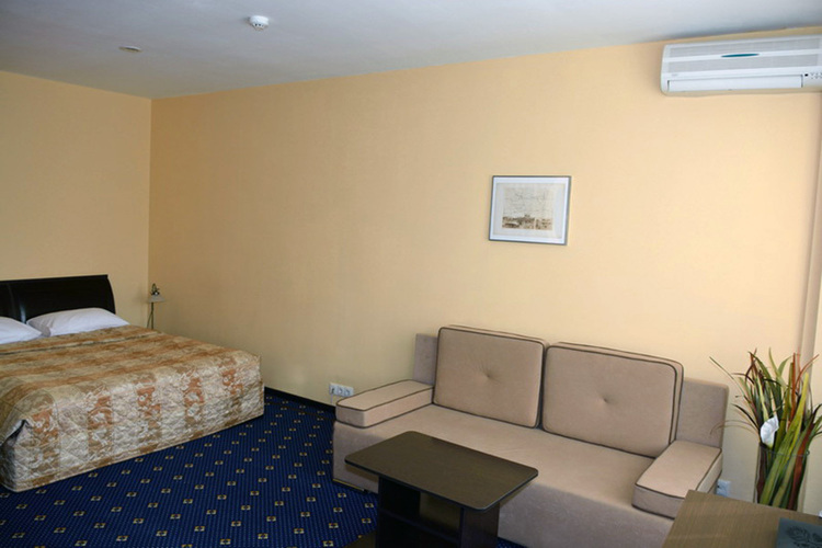 Номера данной категории отличаются дизайном в европейском стиле и увеличенной площадью – до 27 кв. м. Визуально комната разделяется на спальную зону с двуспальной кроватью и зону отдыха, оборудованную мягким диваном и журнальным столиком. Есть ЖК телевизор, индивидуальный кондиционер, холодильник.