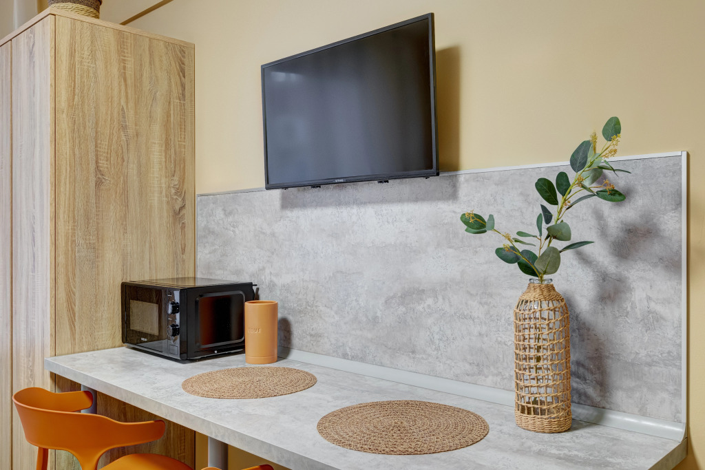 В номере вы найдёте телевизор. Оснащение зависит от выбранной категории номера.