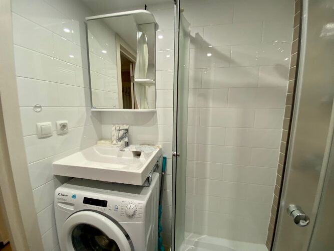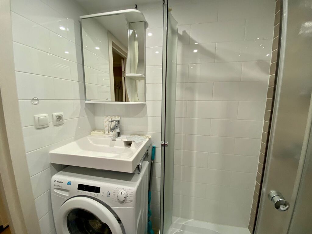 В ванной комнате: шкафчик с зеркалом для хранения средств личной гигиены, одноразовые гели, шампуни, мыло, тапочки.